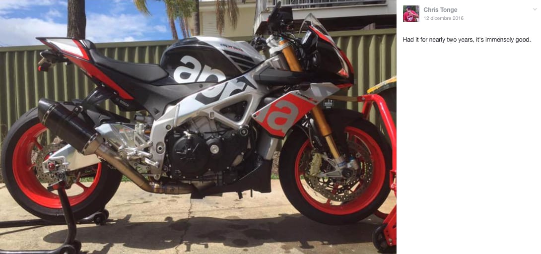 E questo, i fans di Aprilia Tuono lo sanno bene. Come Cris Tonge che posta, sulla pagina facebook del magazine australiano, la foto della sua Tuono “immensely good”.