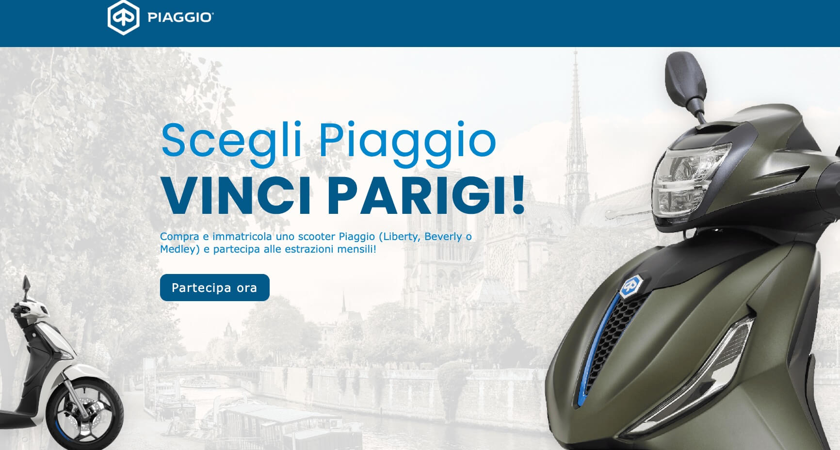 Ottobre 2025 – Una bella sorpresa per i clienti italiani: acquistando e immatricolando un veicolo Piaggio – Liberty, Beverly o Medley – nei mesi di ottobre, novembre e dicembre si può partecipare ogni mese all’estrazione di un fantastico viaggio per 4 persone con destinazione Parigi.