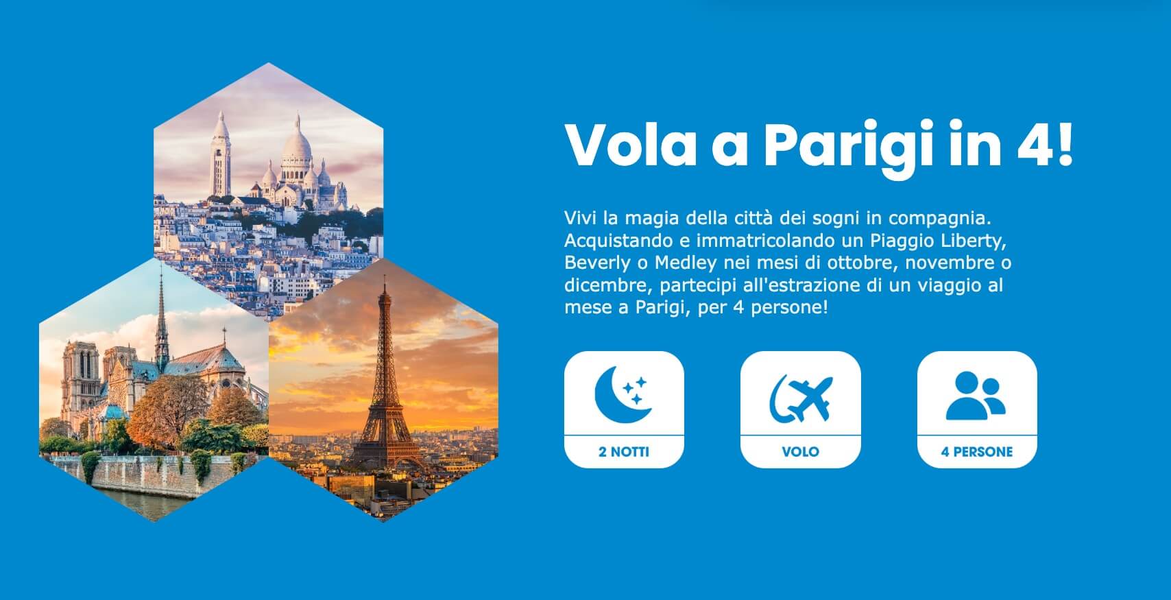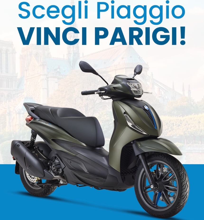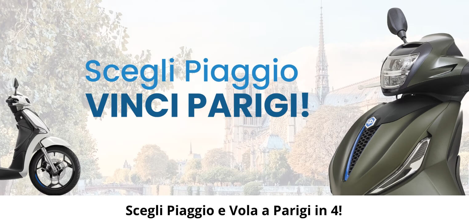 Concorso a premi denominato “Scegli Piaggio e vola a Parigi in quattro!” Valido dal 15/10/2025 al 31/12/2025 – ultima estrazione finale il 19/01/2026 Montepremi: 78 caschi e 3 soggiorni (compreso volo): pari a 29.202,00€.