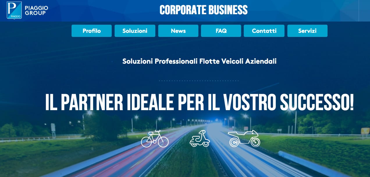Il Gruppo Piaggio, leader europeo nel mercato delle due ruote, ha una lunga tradizione e una consolidata esperienza anche nella produzione di veicoli destinati a impieghi professionali (di serie o specificatamente allestiti). Attraverso l’ente Corporate Business, soddisfa le specifiche esigenze di mobilità di aziende di servizi (es. Servizi Postali), società di consegna a domicilio (merci, food), di noleggio veicoli, di forze di Polizia e di Sicurezza, di organismi di Pronto Intervento e primo soccorso.