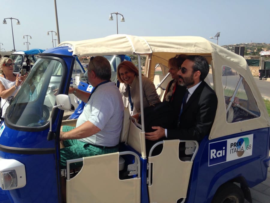 LAMPEDUSA: AL 68° PRIX ITALIA. La richiesta di supporto è giunta dalla Presidenza della Rai: disporre sull’isola di Lampedusa di una flotta di Ape Calessino in servizio “shuttle” per gli ospiti dell’evento internazionale, tra delegati e giurati. Ed eccoli gli otto eleganti Ape Calessino, con livrea personalizzata con il logo dell’evento Prix Italia, che hanno viaggiato su e giù per l’isola, tra porto, aeroporto e centro, muovendosi con agilità anche nelle vie strette e in saliscendi. Hanno trasportato personalità (a cominciare dalla Presidente della Rai Monica Maggioni, nella foto qui sotto, ndr) e numerosi partecipanti dell’evento.