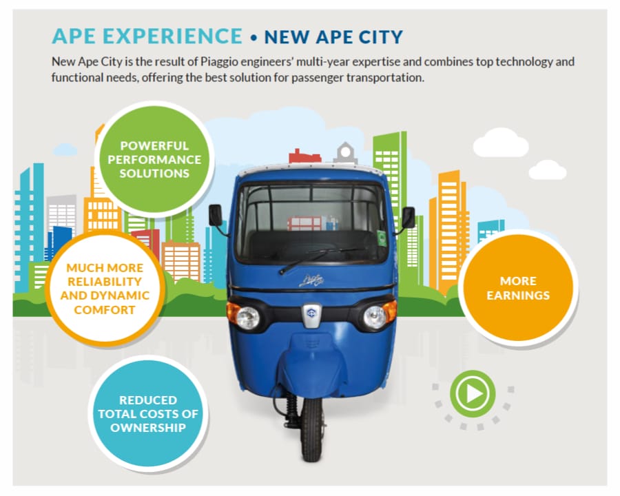 APE’ ROMANZA – OFFICIAL VIDEOUn successo commerciale che dura da decenni, basato sui notissimi punti di forza: robustezza, affidabilità, bassi consumi e costi di manutenzione, design “Italian style” e un “heritage” unico nel suo genere. Le due nuove versioni – City e Romanza – entrambe destinate ai servizi di trasporto persone, sono state progettate e realizzate nel segno dell’evoluzione tecnologica e del design.