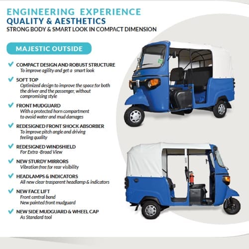 Nuovi gli eleganti interni e la strumentazione del quadro di bordo, “Romanza” è equipaggiata con motore a benzina 200cc a 4 tempi e 4 marce, ed è capace di “scalare” strade con pendenze fino al 22%; offre consumi e costi di manutenzione contenuti, affidabilità e comfort per guidatore e due passeggeri.