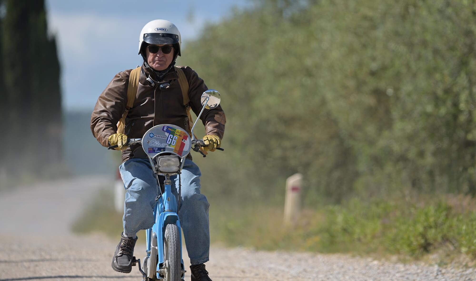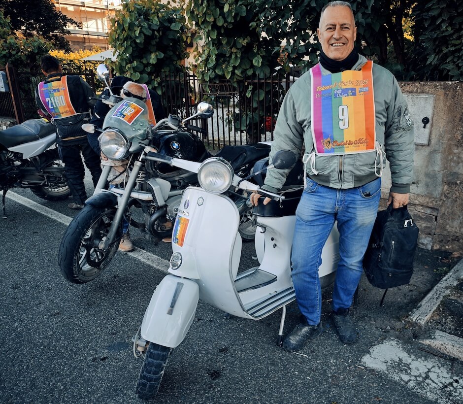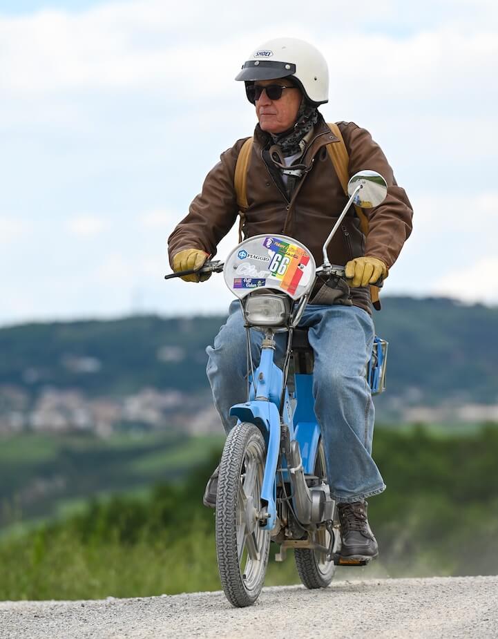 Andrea Sabatini alla partenza dell’edizione 2025 in sella al suo ciclomotore Piaggio Ciao. Photo courtesy dell’autore.