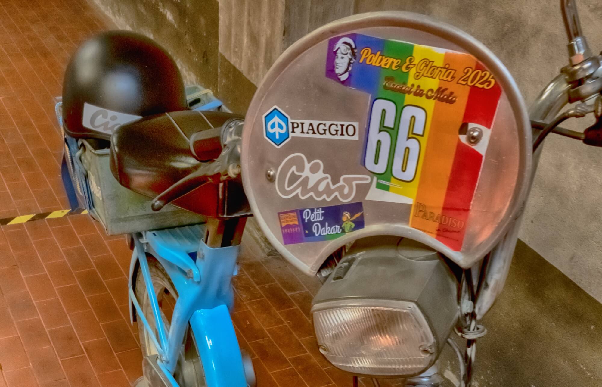 La manifestazione Polvere & Gloria 2025 ha visto quest'anno alla partenza circa 300 veicoli, compresi un sidecar e il mio Ciao. Le categorie sono due: "Eroiche" (veicoli omologati fino al 31.12.1999) e "Saranno famose" (omologati dal 01.01.2000); il numero del pettorale viene fornito da 1 in avanti per le "Eroiche", e dal 2000 in avanti per le "Saranno famose". Categoria novità di quest’anno: i veicoli Zero+ con motore elettrico. E, dedicata alle super stradali, la categoria Friends.