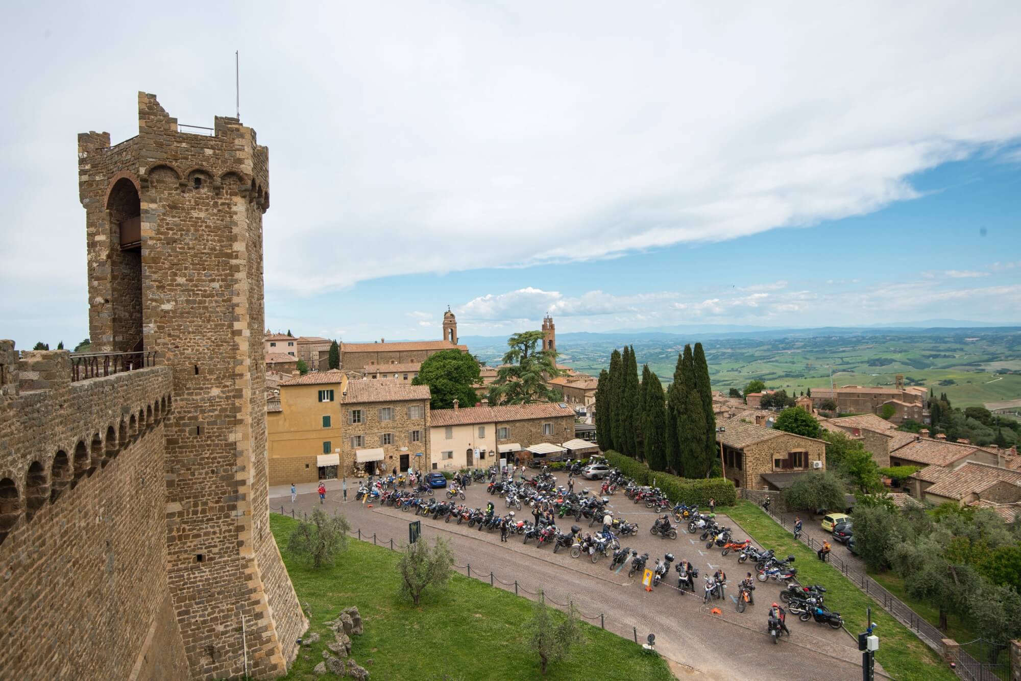 All'arrivo di Montalcino, tappa con fermata obbligatoria per il timbro sul documento di percorso, abbiamo fatto un ingresso plateale con gli applausi dei presenti e della Polizia Locale che ci ha scortato fino alla Piazza sotto il Castello che era stata riservata ai Polverosi Eroici. Otto ore per completare i 208 Km del percorso, sicuramente oltre il 50 % in strade sterrate.... le famose "strade bianche", dove il ‘CIAINO’ non si è mai, dico mai, lamentato! A onor del vero si è lamentato un paio di volte, ma soltanto quando il carburatore chiedeva la riserva di miscela!