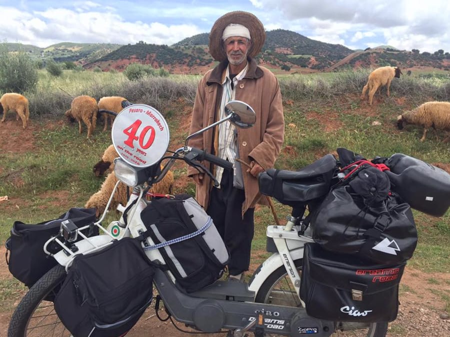 Tutta la sua vita personale e professionale, da world discoverer e film-maker, è segnata dal viaggio: sin dal primo raid in solitaria compiuto a 18 anni nel 1976 e che, 40 anni dopo, tra aprile e maggio, ha replicato in sella allo stesso motorino (un Piaggio Ciao 50cc), lungo lo stesso percorso, dalla “sua” Pesaro fino a Marrakech, in Marocco. Oltre 3.400 chilometri, via Francia e Spagna, viaggiando “slow” su strade statali e provinciali.