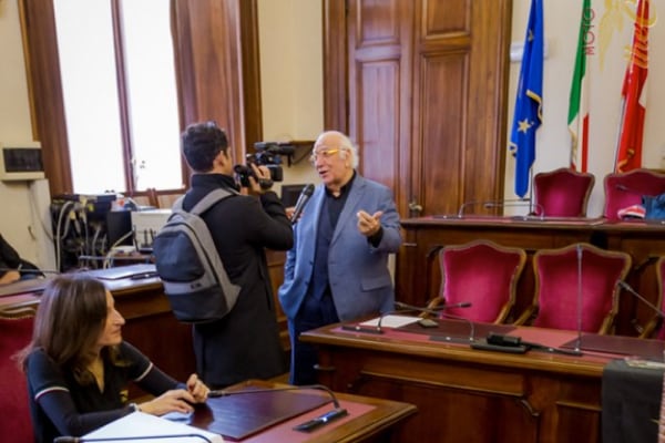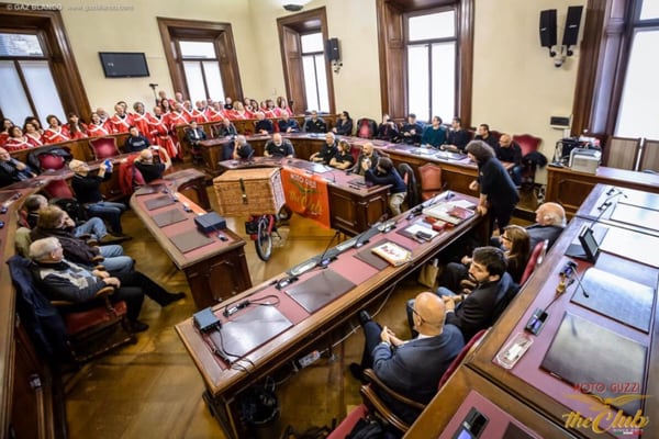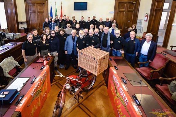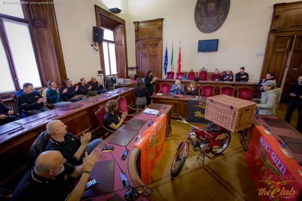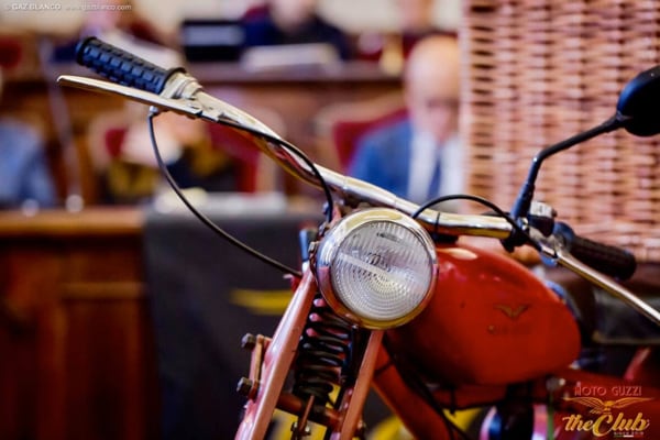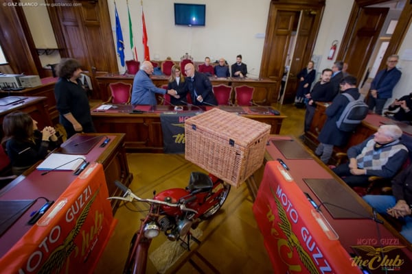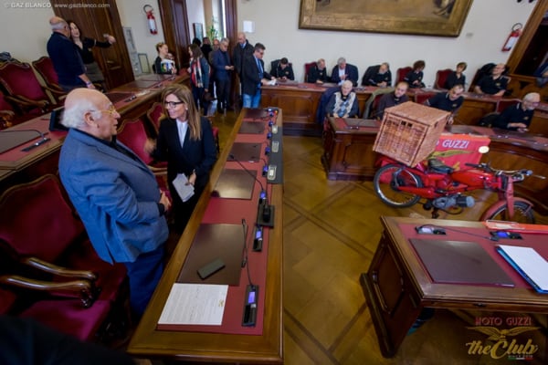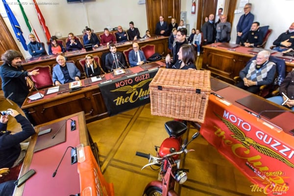 Giovanni Rana ha portato nella sala del Consiglio Comunale il suo Guzzino (Motoleggera 65, modello prodotto tra il 1946 e il 1954), equipaggiato con una grande cesta di vimini come portapacchi, che è stato – ha raccontato – il suo “compagno” di lavoro agli esordi ed a cui è molto affezionato.