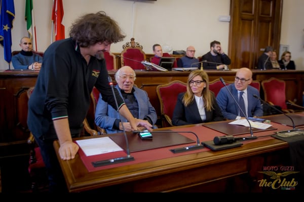 A sinistra, la locandina-invito del club; a destra, Giovanni Rana parla nella sala consigliare del Comune di Piacenza (foto di Gaz Blanco, fonte: pagina facebook MGTC: it-it.facebook.com/motoguzzitheclub).