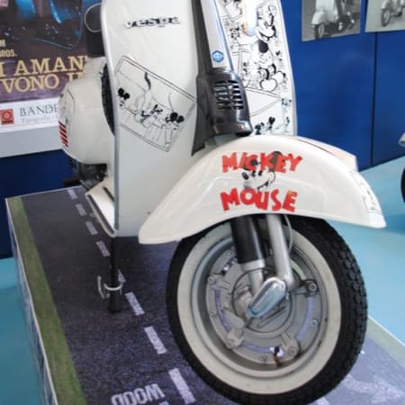 Una Vespa Special 50 bianca, decorata con le strips di Topolino, l’inossidabile eroe dei fumetti Mickey Mouse. Originale e divertente anche la base espositiva con vignette. Opera di: Disegno Restyle by Germana Triani.