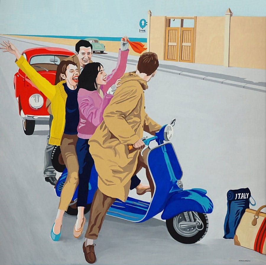 Nelle sue opere è ricorrente il tema del viaggio e della mobilità, con uno sguardo “nostalgico”. Da dove nasce questa scelta creativa? “La scelta riguardo alle mie opere nasce da una situazione “maturata” nel tempo, che era latente ma viva nel pensiero, tutto si è concretizzato nel vedere spesso per strada mezzi d’epoca che da soli mi riportavano indietro nel tempo, li isolavo mentalmente per creare una storia, un sogno, ma che risultavano anche per me di grande attualità, auto e Vespe con linee inconfondibili, direi uniche. E devo dire, con un pizzico di orgoglio, che ho iniziato il progetto delle mie opere ben prima che ci fosse un revival mediatico e commerciale relativo a quel periodo”.