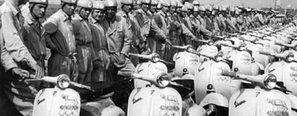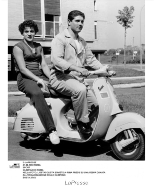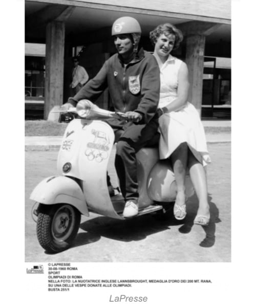 La Piaggio mise a disposizione dell’organizzazione dei Giochi 100 Vespa (schierate nella foto sopra con i collaudatori), che sfilarono in corteo d’onore per le vie della capitale, con in sella altrettanti campioni, fino in piazza San Pietro, in Vaticano, per il saluto dell’allora Papa Giovanni XXIII alle atlete ed agli atleti di tutto il mondo, che poi posavano con il mitico scooter nel villaggio olimpico, come testimoniano queste immagini storiche di La Presse.