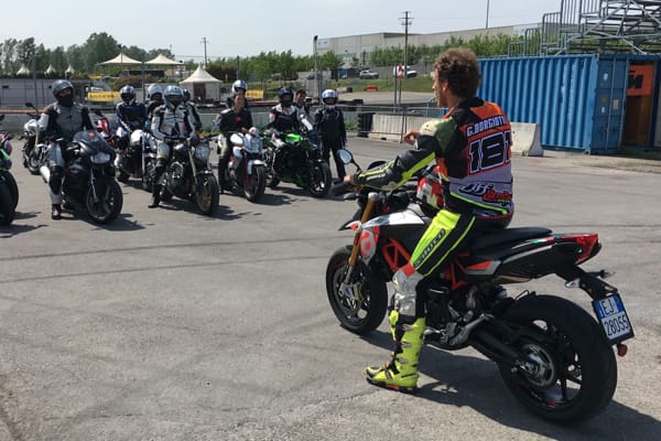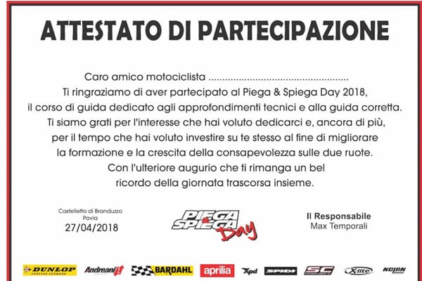 In moto sì, ma prima si va…a scuola! Ottima quella organizzata da Massimo Temporali, giornalista e commentatore WSBK su Italia 1, motociclista esperto. La sua iniziativa ha nel titolo stesso il programma “scolastico”: “Piega & Spiega Day”, che punta a migliorare la guida motociclistica e le conoscenze tecniche dei bikers meno esperti, sottolineando l’aspetto sicurezza. L’ultima edizione si è svolta con successo venerdì 27 aprile 2018, ospitata dall’Autodromo di Castelletto di Branduzzo (Pavia).