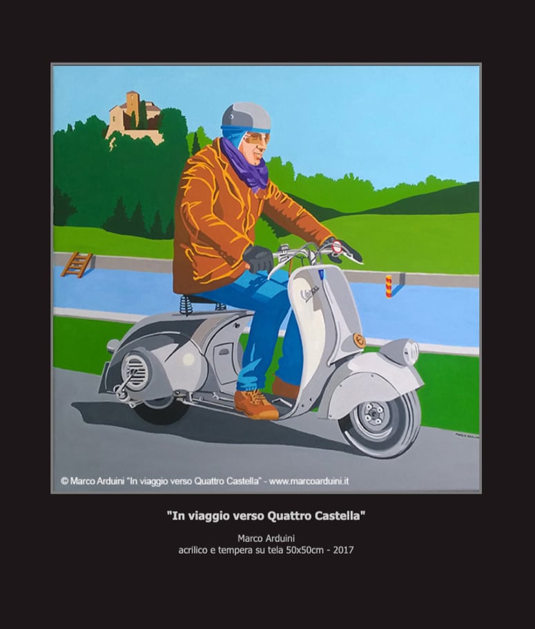 E del viaggio e dei mezzi per viaggiare Marco Arduini (Reggio Emilia, 1959; artista, pittore, incisore), ha tratto sovente ispirazione per delineare la “cifra” del suo essere artista. Le sue opere, coloratissime, pop, ever green, spesso sorprendenti, infondono ottimismo e voglia di… andare, esprimendo un insopprimibile senso di libertà e desiderio di autonomia, via dalla “pazza folla” e da tutto quello che ci tiene “fermi”. Che sia con un aereo, una utilitaria o una Vespa, l’importante è mettersi in viaggio.