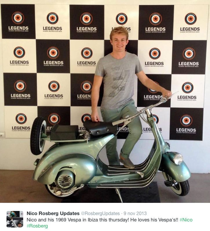 Il pilota Nico Rosberg (che gira in Vespa quando è in vacanza a Ibiza) sfoggia il suo pregiato modello vintage del 1969, dichiarando il suo amore per lei.