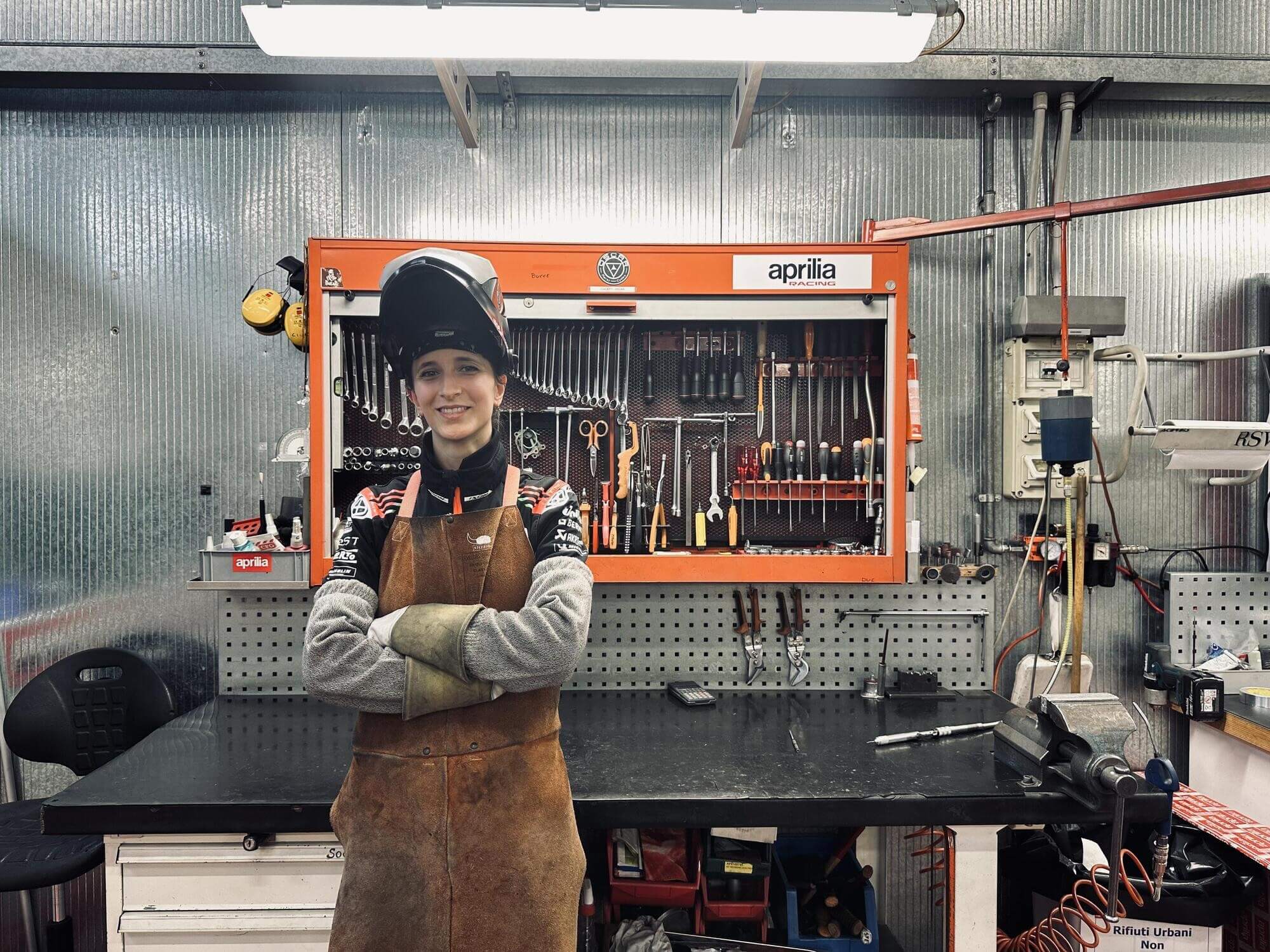 Sx, Monica Di Pardo. Dx, Cristina Toteri, meccanico veicolo in Aprilia Racing, Reparto Corse-Noale (specializzata in saldature moto da corse, vincitrice del 12° Premio ‘Semplicemente Donna” che valorizza donne portatrici di valori positivi, trasmessi a migliaia di studentesse e studenti incontrandoli nelle scuole).