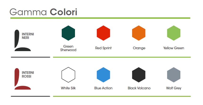 L’ampia gamma colori propone otto tinte: Green Sherwood, Red Sprint, Orange e Yellow Green in abbinamento a interni neri, e White Silk, Blue Action, Black Volcano e Wolf Grey in abbinamento con gli interni rossi.