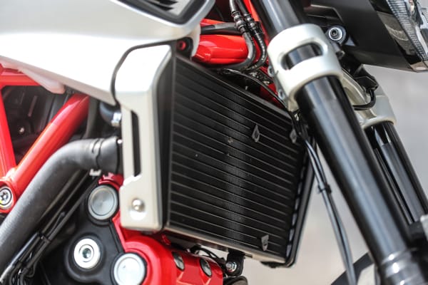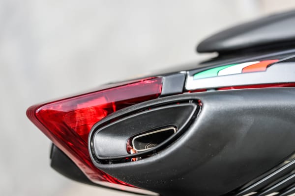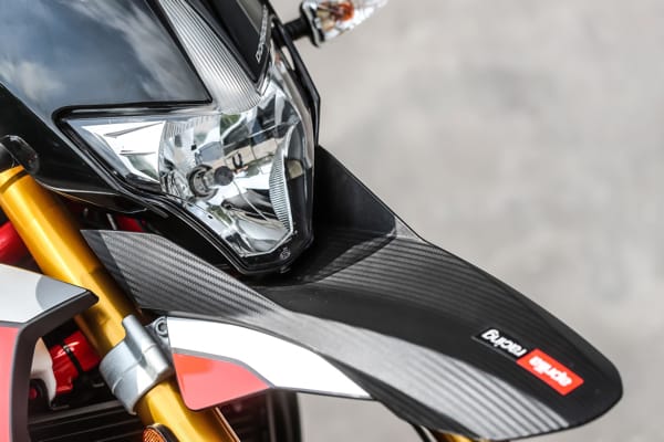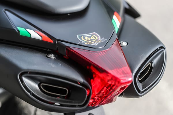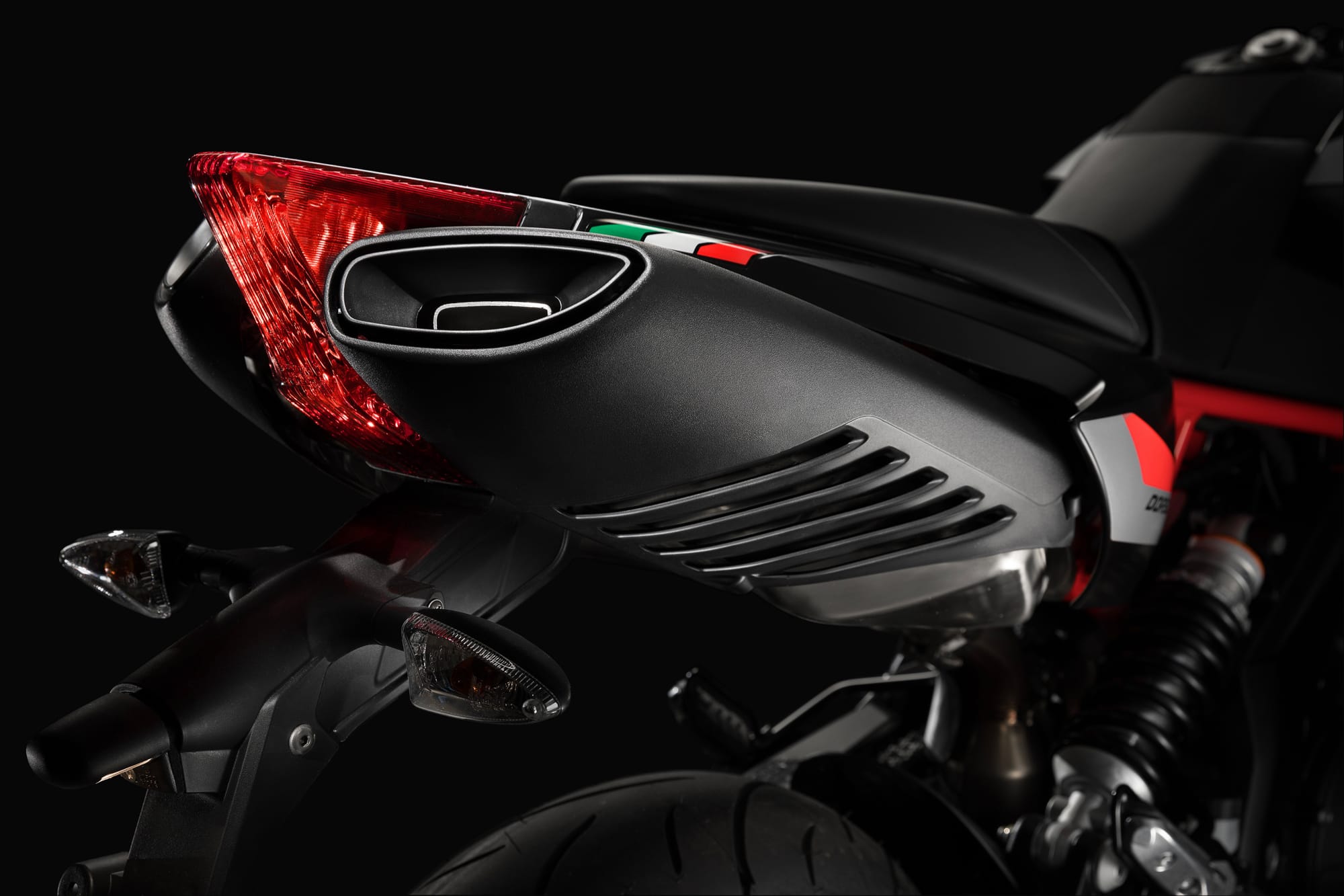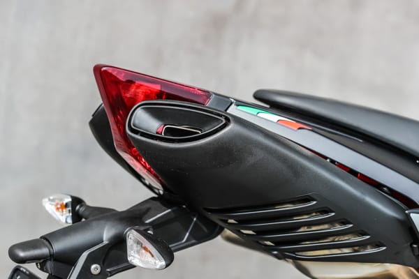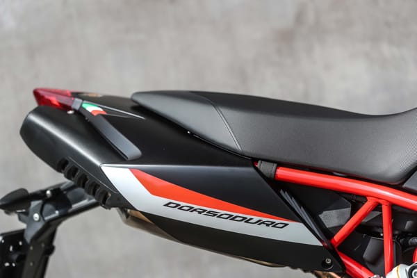 Il codino è uno degli aspetti estetici più rappresentativi di Dorsoduro: snello e sinuoso, accoglie anche i terminali di scarico sdoppiati, una soluzione che permette un’eccellente simmetria nelle proporzioni e nella distribuzione dei pesi. Il telaio e i coperchi per le teste dei cilindri, verniciati in rosso, rappresentano un ulteriore forte richiamo alla sportività: finiture grintose che si abbinano alle nuove grafiche nell’inedita tinta Adrenalinic Silver.