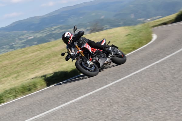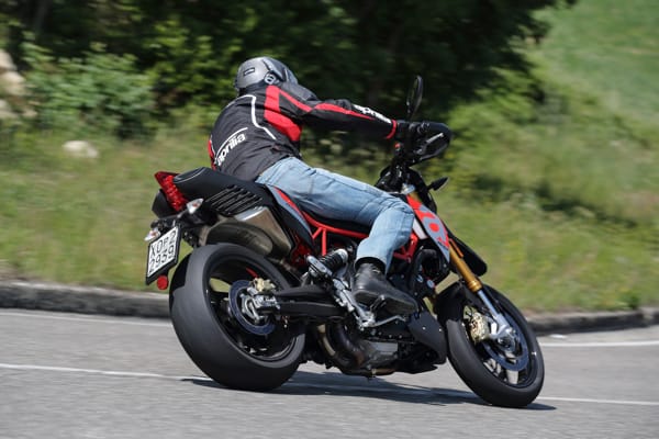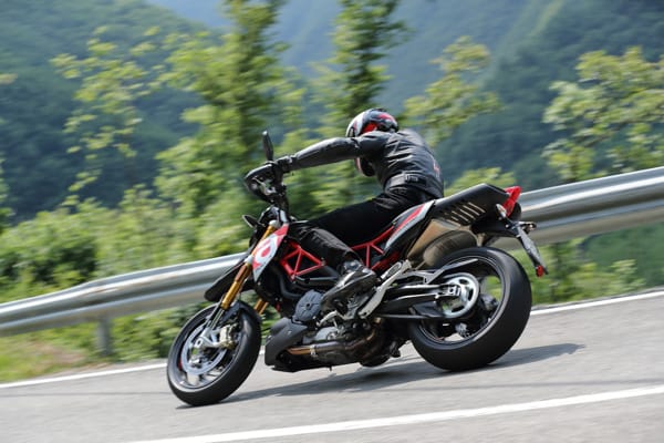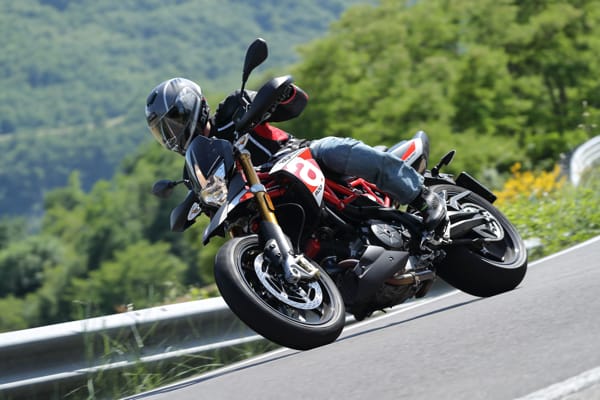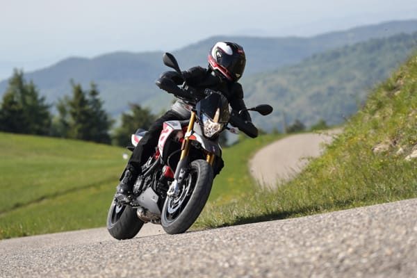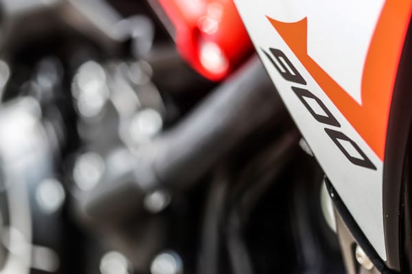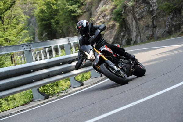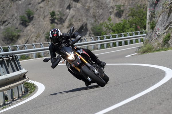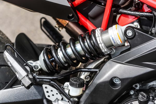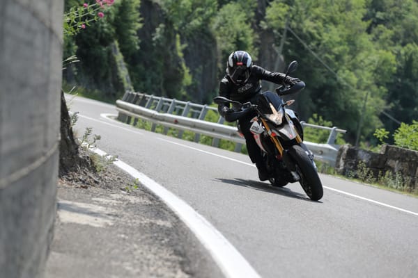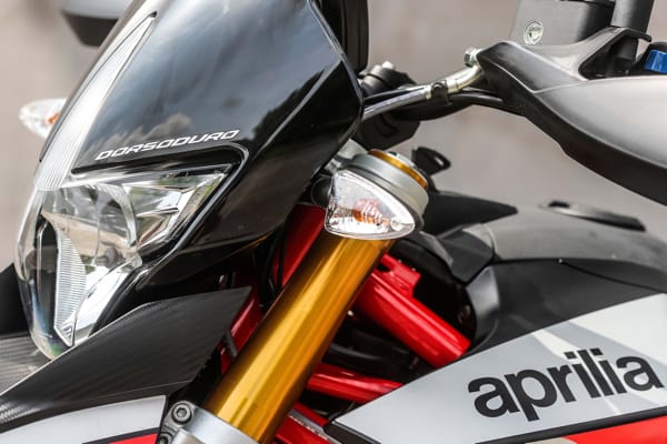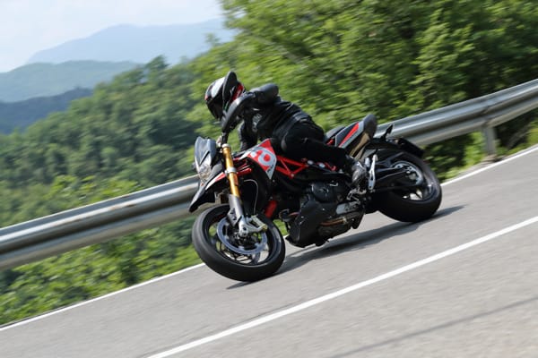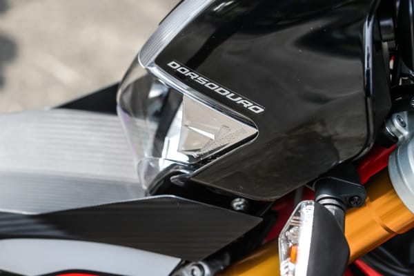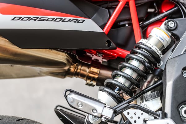 Un altro particolare tecnico fortemente distintivo è costituito dal posizionamento laterale e inclinato dell’ammortizzatore, un’unità regolabile nel precarico molla e nell’idraulica in estensione. Tale soluzione ha reso disponibile spazio prezioso per una conformazione ottimale dei collettori di scarico senza incidere sulla lunghezza della moto e senza andare a stressare termicamente l’ammortizzatore. Il forcellone in alluminio è dimensionato per sopportare le sollecitazioni asimmetriche dovute al posizionamento laterale dell’ammortizzatore e vanta caratteristiche di rigidità torsionale ed elasticità indispensabili per avere precisione in appoggio e feeling di guida nelle fasi transitorie. Debutta su Dorsoduro 900 una nuova forcella Kayaba (abbinata a piastre di sterzo in alluminio forgiato) più leggera di 450 grammi, regolabile nell’idraulica in estensione e nel precarico molla, in grado di sostenere meglio le sollecitazioni della guida sportiva e di copiare al massimo le imperfezioni del manto stradale, restituendo controllo nella guida d’attacco e maggiore comfort in quella rilassata. Il miglior comportamento in generale di entrambe le sospensioni di Dorsoduro 900 è merito anche della nuova coppia di cerchi ruota a tre razze sdoppiate, oltre 2 kg più leggeri di quelli che equipaggiavano Dorsoduro 750. Riducendo l’effetto giroscopico aumenta la maneggevolezza e l’accelerazione, oltre ad avere benefici sul comportamento delle sospensioni per via della riduzione delle masse non sospese.