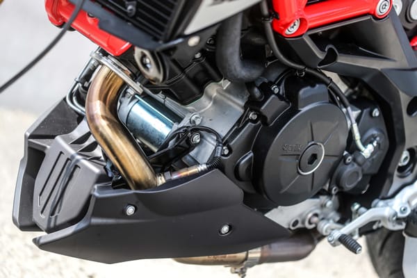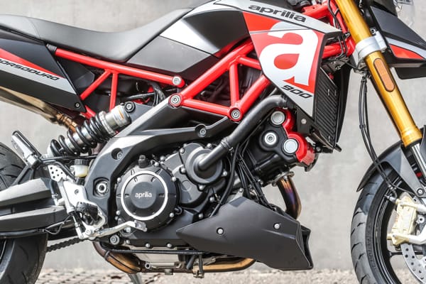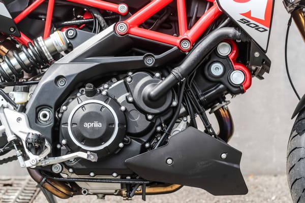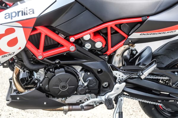 Pur rimanendo invariata l’architettura – angolo a 90 gradi tra i due cilindri, distribuzione a quattro valvole per cilindro, doppio albero a camme in testa e raffreddamento a liquido – il nuovo motore è stato oggetto di diversi interventi: un importante lavoro mirato alla riduzione degli attriti è stato fatto sui pistoni, completamente riprogettati e ora caratterizzati da uno speciale riporto antifrizione sul mantello, mentre nuovi spinotti hanno portato a un alleggerimento degli organi in moto alternato. L’albero motore, anch’esso nuovo, presenta una differente equilibratura Un nuovo e più efficiente circuito di lubrificazione interna a carter semi-secco riduce le perdite di potenza da sbattimento e mantiene limitati consumo e temperatura del lubrificante, rendendo così non necessario l’utilizzo del radiatore olio. Il propulsore adotta inoltre nuovi iniettori: una migliore nebulizzazione della miscela aria/carburante, ottenuta attraverso l’incremento della pressione di alimentazione, apporta benefici sul fronte dei consumi e delle emissioni, contribuendo così a rientrare nei limiti stabiliti dalla normativa antinquinamento Euro 4. Un risultato raggiunto anche grazie all’impianto di scarico, dotato di doppia sonda Lambda. Il motore di Aprilia Dorsoduro 900 è equipaggiato anche con un decompressore automatico, utile a facilitare l’avviamento in condizioni di basse temperature.