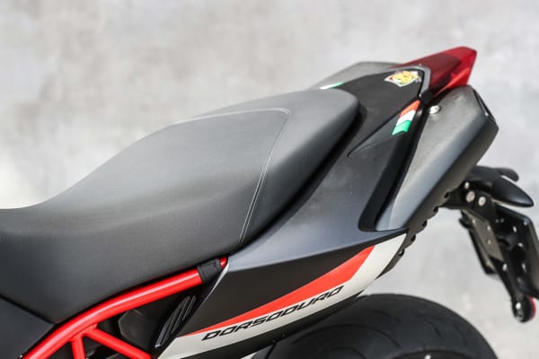 IL DESIGN: IL PUNTO DI EQUILIBRIO TRA FORMA E FUNZIONE. Il progetto di Aprilia Dorsoduro 900 pone al centro il divertimento del pilota: per questo motivo le sovrastrutture sono ridotte al minimo indispensabile, in quanto non è previsto tutto ciò che non è essenziale ai fini della performance e del massimo piacere di guida. Sono invece gli elementi tecnici a giocare un ruolo fondamentale, diventando essi stessi parte fondamentale del design. Non sono solo i paramani al manubrio e il portanumero presente sulla mascherina anteriore a sottolineare la vicinanza con il mondo delle competizioni. Anche le forme della zona centrale, quella più interessata ai movimenti del pilota durante la guida sportiva, evidenziano lo studio realizzato per ottenere un’ottima compattezza dimensionale, che permetta al pilota di trovare da subito il massimo feeling. I tecnici Aprilia hanno ottenuto tale risultato progettando una sella lunga e piatta, di derivazione chiaramente sportiva, in grado di assicurare sempre la più efficace posizione di guida e consentire ampia possibilità di spostamento longitudinale.