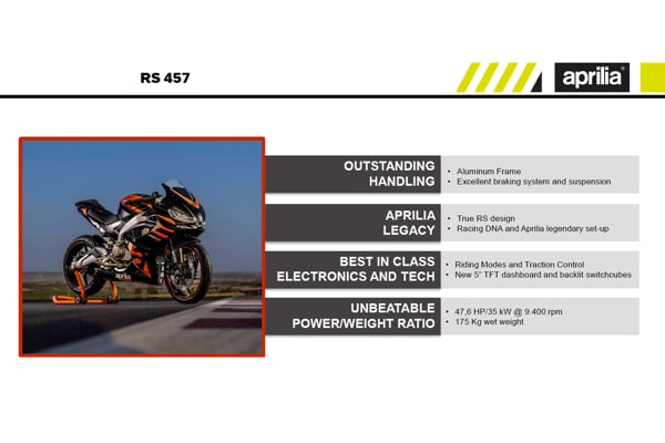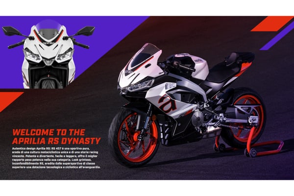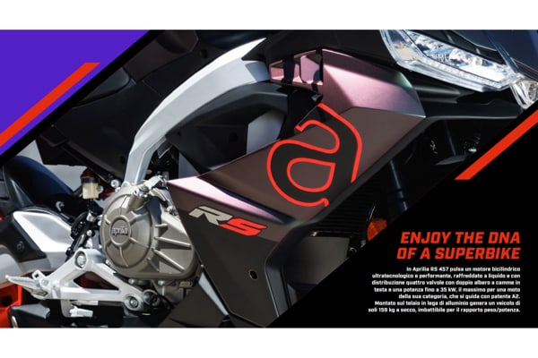 A partire dal 2020 il grande successo di Aprilia RS 660 ha rivoluzionato il mondo delle sportive di media cilindrata creando un nuovo segmento. La stessa formula vincente si ripete con Aprilia RS 457 che nasce come un progetto completamente nuovo, pensata e sviluppata nell’HQ di Noale, dove nascono tutte le Aprilia, comprese quelle impegnate in MotoGP. La nuova Aprilia diventa l’ideale anello di congiunzione tra le prime motorizzazioni 125, e la RS 660, e va a completare la famiglia RS che arriva fino alle potenti superbike V4 e, nella sua massima espressione tecnologica, alla RS-GP, vincitrice di GP nel Motomondiale.
