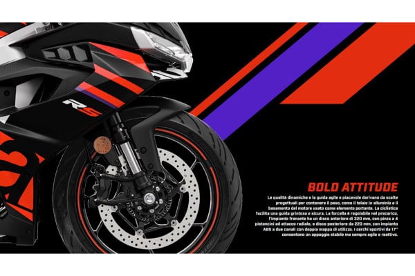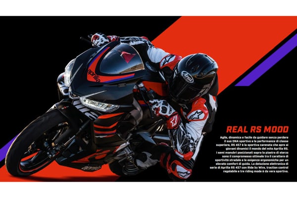 Una moto che ha i suoi punti di forza nella leggerezza vantando il miglior rapporto peso potenza possibile per una moto guidabile con patente A2, nella facilità di guida, nella dotazione tecnologica. RS 457 è pensata per accompagnare il motociclista nella sua crescita, sia in strada sia tra i cordoli della pista. L’ergonomia è infatti caratterizzata dai semi manubri montati sopra la piastra di sterzo, una soluzione da sportiva stradale per avere il migliore compromesso tra sportività e comodità nella guida.