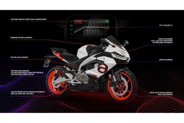 Il risultato è una moto che esprime leggerezza e dinamicità già a partire dal frontale di sezione ridotta, caratterizzato dal triplo gruppo ottico anteriore full LED, cifra stilistica di tutte le sportive Aprilia, incorniciato dai futuristici profili perimetrali che integrano anche gli indicatori di direzione.
