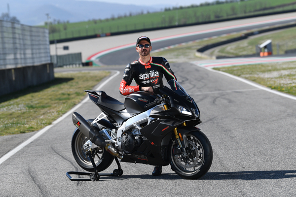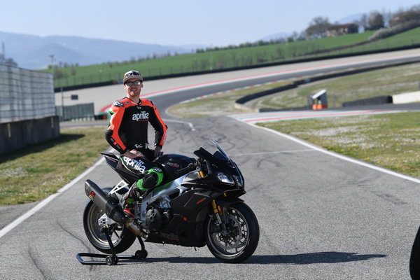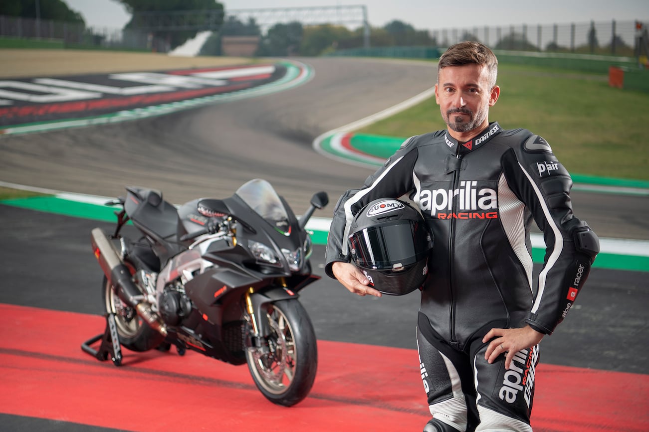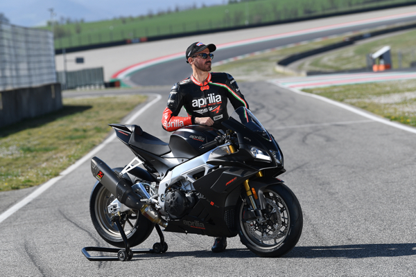 Max Biaggi e la nuova Aprilia RSV4 1100 Factory sul circuito di Imola.