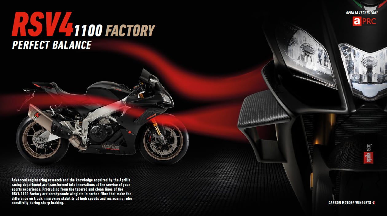 Coerentemente all’esclusività di questo modello, il Centro Stile di Aprilia ha lavorato per rendere RSV4 1100 Factory unica e riconoscibile anche dai colori e dalla cura dei dettagli. Gli accostamenti cromatici puntano a esaltare l’esclusività dei materiali nobili come il carbonio (del parafango anteriore, dei fianchetti, della protezione del terminale di scarico e delle appendici aerodinamiche), a contrasto con la finitura in titanio del terminale di scarico omologato Akrapovic, tonalità ripresa dai cerchi in alluminio forgiato. Per le grafiche delle sovrastrutture è stato scelto un accattivante look total black opaco che permette di esaltare tutta la bellezza dello scultoreo telaio a doppio trave e del forcellone realizzati in alluminio. Viste le incredibili prestazioni raggiunte da RSV4 1100 Factory, Aprilia introduce per prima su una superbike di serie le appendici aerodinamiche sulla carenatura, grazie proprio allo sviluppo fatto da Aprilia Racing nel prototipo RS-GP, dalle quali derivano. La particolare forma studiata in galleria del vento e l’inclinazione con cui sono montate sfruttano la pressione verso il basso dell’aria incanalata, consentono alle winglets di aumentare la stabilità alle alte velocità, contribuendo a diminuire la tendenza all’impennata in uscita di curva e aumentando al contempo la stabilità nelle staccate violente.