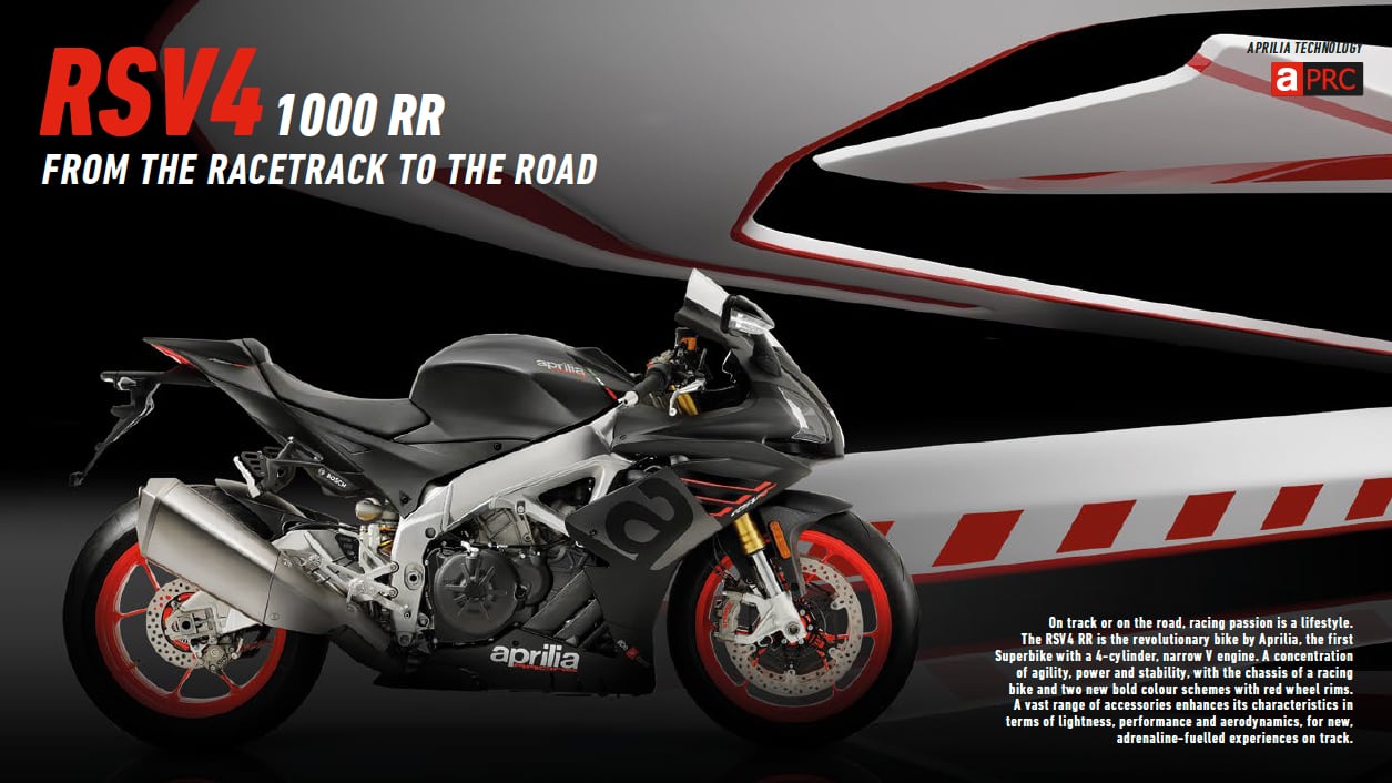 DA UN PROGETTO STRAORDINARIO CHE NON SMETTE DI CRESCERE, ECCO LA RSV4 PIÙ VELOCE, POTENTE E LEGGERA DI SEMPRE. NUOVO MOTORE V4 DA 217 CV. CICLISTICA E FRENI ANCORA EVOLUTI E PESO RIDOTTO. LA VERSIONE RR, DOTATA DI MOTORE V4 DI 1000 CC DA 201 CV, È OFFERTA IN DUE NUOVE ACCATTIVANTI VESTI GRAFICHE. IN OPTIONAL UN EVOLUTO TRACK KIT.