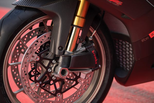 Anche l’impianto frenante, già al top nella precedente versione, ha beneficiato di importanti aggiornamenti: le pinze anteriori Brembo Stylema®, più leggere ed efficaci, prendono il posto delle M50 e sono dotate ora di pastiglie dal coefficiente di attrito più performanti. Le nuove pinze freno possono essere abbinate alla coppia di convogliatori dell’aria in carbonio (simili a quelli usati da Aprilia Racing sulla RS-GP), che permettono di tenere sotto controllo la temperatura di esercizio, assicurando la medesima eccezionale performance in frenata anche nell’utilizzo più estremo. Il peso in ordine di marcia con serbatoio pieno di RSV4 1100 Factory si attesta a 199 kg, grazie all’introduzione del nuovo terminale di scarico in titanio Akrapovic e della nuova leggerissima batteria al litio Bosch.