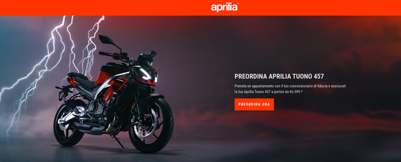 Aprilia Tuono 457 è la Tuono più giovane e irriverente che ci sia, ultima erede di una tradizione d’eccellenza di moto sportive col manubrio alto e dalla guida adrenalinica. È una vera naked pensata che porta con sé tutta la tecnologia Aprilia. Per aggiudicarsi uno dei primissimi esemplari della nuova Tuono 457, da oggi e fino al 28 marzo basta accedere al sito web APRILIA.COM, alla pagina: Tuono 457 / Aprilia IT, scegliere un concessionario Aprilia e fissare un appuntamento.