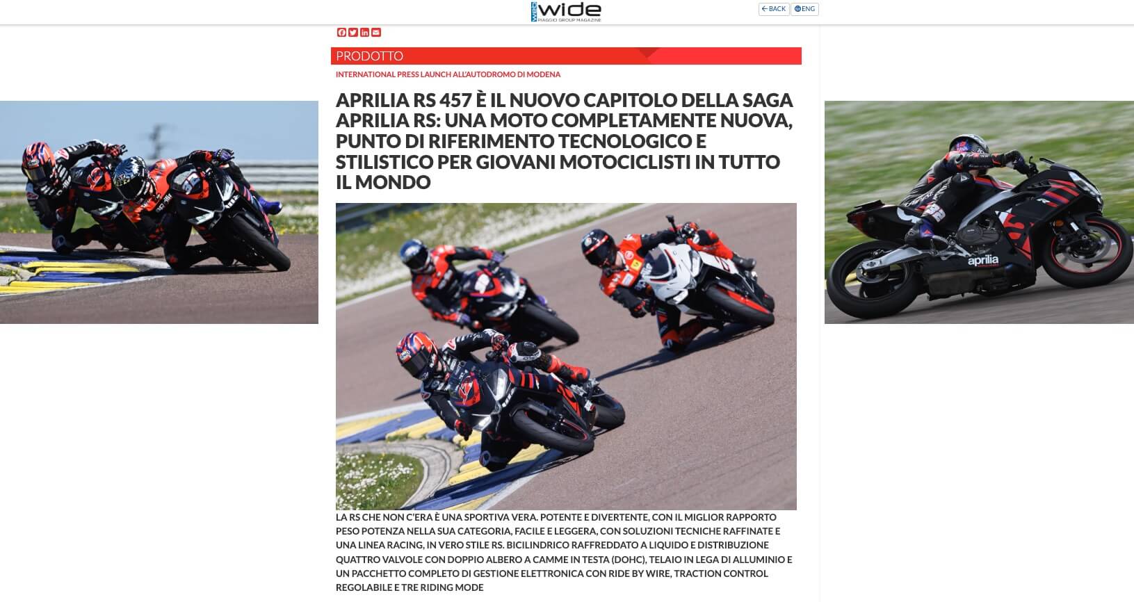 9 dicembre 2024 - Aprilia RS 457 è la migliore moto stradale leggera “best lightweight streetbike” secondo Cycle World. L’autorevole magazine americano ha incoronato la bicilindrica Aprilia nel suo anno di esordio, e – puntualizza Cycle World – non si è certo trattato della “fortuna del principiante”. In un segmento tra i più combattuti a livello mondiale, Aprilia RS 457 ha messo in campo un progetto straordinario, che ha trasferito nella classe “quattro e mezzo” tutta la tecnologia e l’esperienza di Aprilia nelle superbike e nelle sportive di più grande cilindrata.