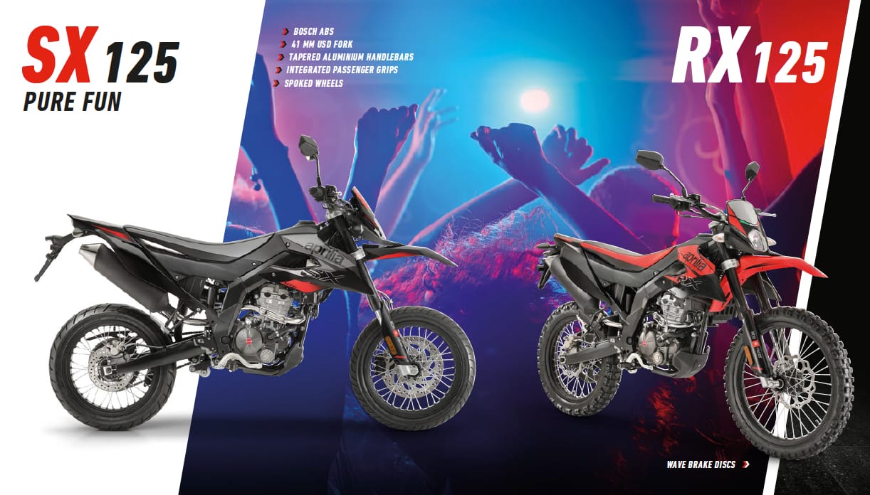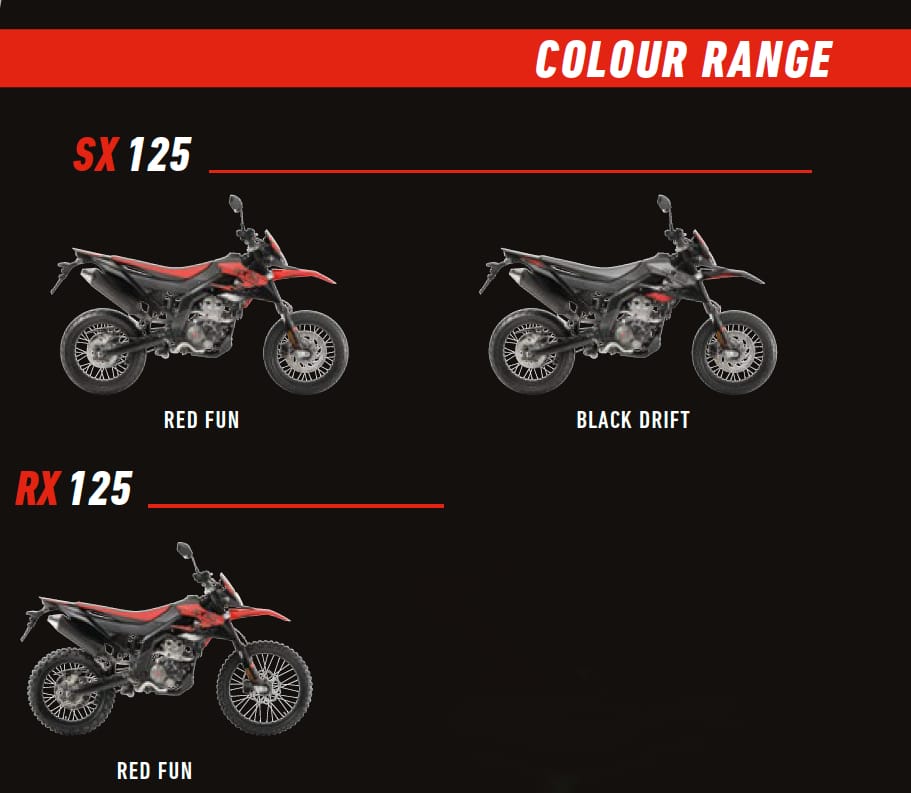 Infine, Aprilia ha dotato SX e RX di una sofisticata strumentazione digitale, compatta, moderna e ben leggibile; il cruscotto digitale multifunzione annovera tra i suoi plus il diario di viaggio, con la possibilità di visualizzare velocità massima e due odometri parziali che segnalano i chilometri percorsi durante le sessioni di guida. Aprilia SX 125 è disponibile nella rete vendita Aprilia nelle varianti grafiche Red Fun e Black Drift, RX 125 nella variante grafica Red Fun.