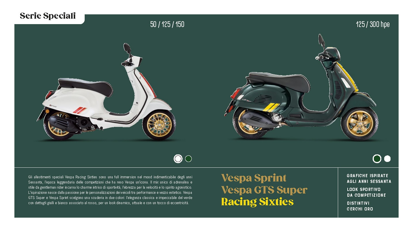 Settembre 2021 – Nel 2021 Vespa festeggia 75 anni, superando il traguardo dei 19 milioni di esemplari prodotti, di cui quasi due milioni negli ultimi dieci anni. Sono 19 milioni di storie, di ragazze e ragazzi, di intere generazioni che in sella a Vespa hanno sognato e guadagnato la libertà. La Vespa è molto più di uno scooter, è un fenomeno culturale mondiale. Stilosa e spensierata, spontanea e semplice, a 75 anni dalla sua nascita Vespa non smette mai di essere contemporanea. E per celebrarla, offriamo ai fans di ieri e di oggi, di tutte le generazioni, una carrellata della ricca Gamma 2021.