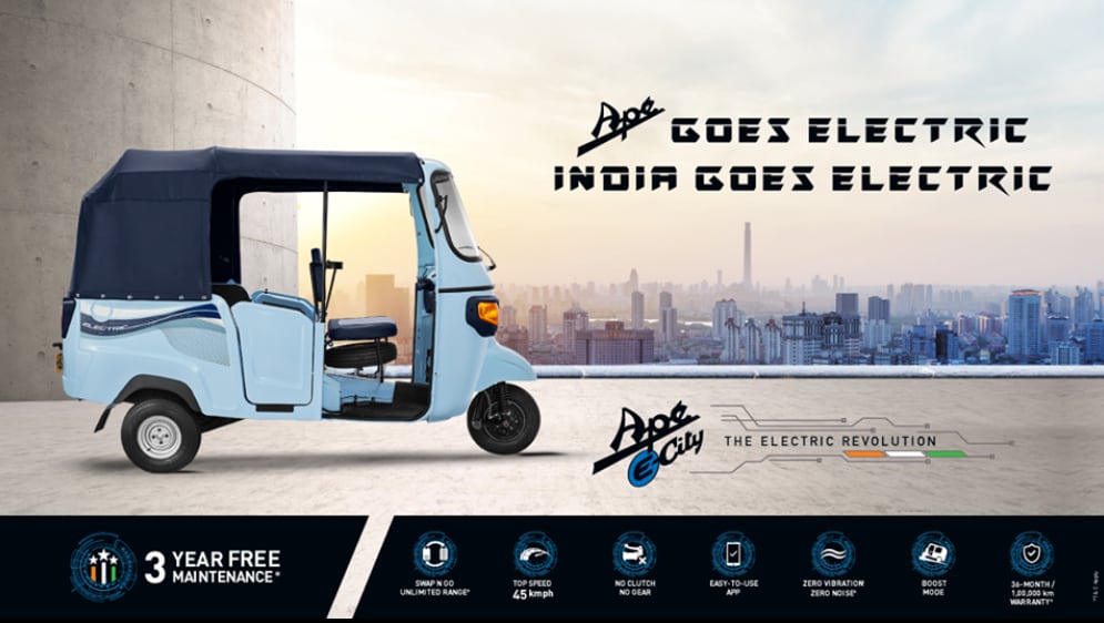 Grazie alla tecnologia battery swap, che consente la sostituzione in pochi minuti della batteria scarica con una carica presso stazioni di servizio automatizzate, Ape E-City rappresenta una risposta efficace alla crescente domanda di soluzioni per la mobilità commerciale, in particolare per quanto riguarda gli spostamenti tra i centri urbani in India, e al sempre maggiore interesse verso le fonti di energia alternative.