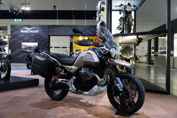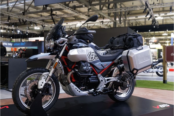 NUOVA GAMMA MOTO GUZZI V85. L’enduro iconica di Moto Guzzi è tra le proposte più originali e affascinanti degli ultimi anni della categoria. È l’unica a vantare uno stile tipico e autentico con la versatilità di una moderna on-off dedicata al turismo avventuroso e riflette una filosofia costruttiva nella quale essenzialità, praticità e leggerezza determinano un rapporto senza filtri tra la motocicletta e l’uomo. A EICMA 2023 Moto Guzzi presenta la nuova V85, evoluta sia a livello stilistico sia tecnico. Sotto il primo aspetto diventa più contemporanea e meglio rifinita, grazie alla totale rivisitazione del design delle sovrastrutture, del parabrezza ora regolabile manualmente, dei comandi al manubrio più intuitivi e pratici da utilizzare e grazie alla nuova strumentazione TFT da 5 pollici. Il metallo lascia il posto al più leggero e rifinito alluminio per i supporti del gruppo ottico anteriore e per il maniglione del passeggero. Molti sono i miglioramenti dal punto di vista tecnico. Il mitico motore bicilindrico a V trasversale di 90° raffreddato ad aria guadagna l’omologazione Euro 5+ e una nuova distribuzione a fasatura variabile che permette di aumentare le prestazioni su tutto l’arco di erogazione. Ora offre 80 CV di potenza massima e 83 Nm di coppia massima. Una importante evoluzione sottolineata dal nuovo design delle teste.