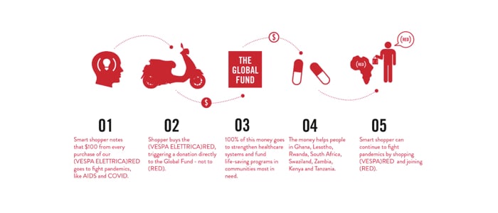 Vespa e (RED) condividono anche la convinzione che ognuno di noi può fare la propria parte nella lotta contro le pandemie e che quindi ciascuno di noi può guidare il cambiamento: chi acquista (VESPA ELETTRICA)RED svolge perciò una azione concreta, dato che per ogni esemplare venduto 100 USD verranno devoluti al Global Fund per sostenere programmi salvavita.