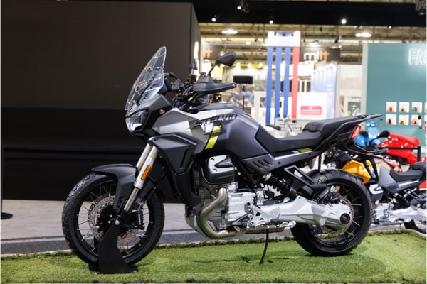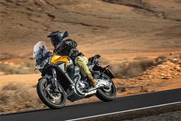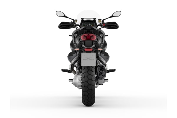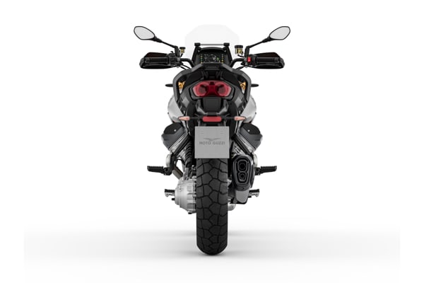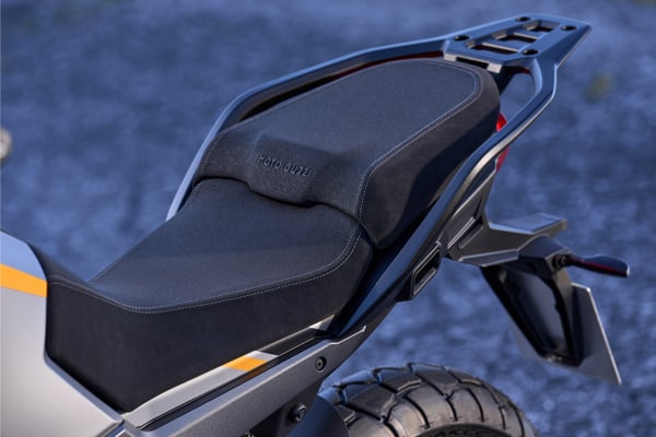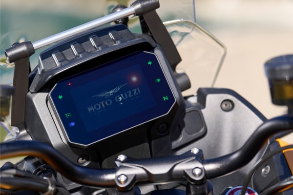 Completano la dotazione di serie l’impianto di illuminazione full LED con DRL, il sistema “bending lights” (la coppia di fari supplementari presenti nelle parabole illumina l’interno della curva, aumentando la visibilità in piega) e la presa USB situata a fianco della strumentazione. Quest’ultima è un pannello TFT a colori da 5 pollici, completissima di informazioni, tra cui figurano livello del carburante, temperatura dell’aria e del liquido refrigerante, indicatore della marcia inserita, autonomia residua e consumo istantaneo. Tra gli accessori è presente Moto Guzzi MIA, la piattaforma multimediale che permette di collegare lo smartphone alla strumentazione via bluetooth estendendo le sue funzioni. Moto Guzzi MIA include sia il sistema di infotainment per la gestione di assistente vocale, telefonate e musica tramite gli intuitivi comandi al manubrio, sia la funzione di navigazione, con la quale è possibile, una volta impostata sullo smartphone la destinazione del proprio viaggio, visualizzare le indicazioni direttamente sulla strumentazione.