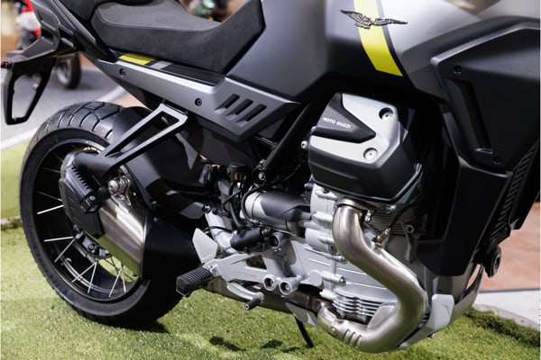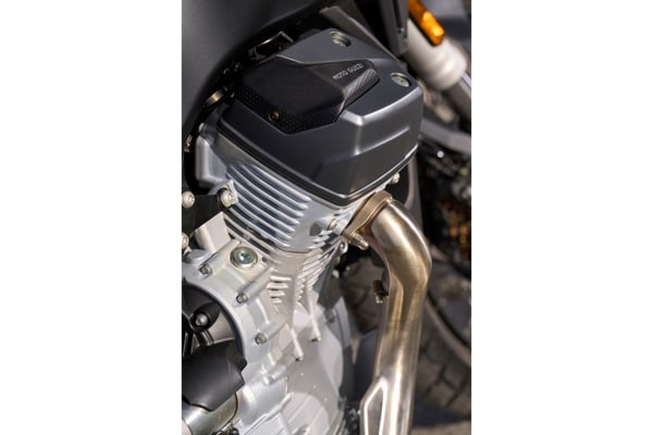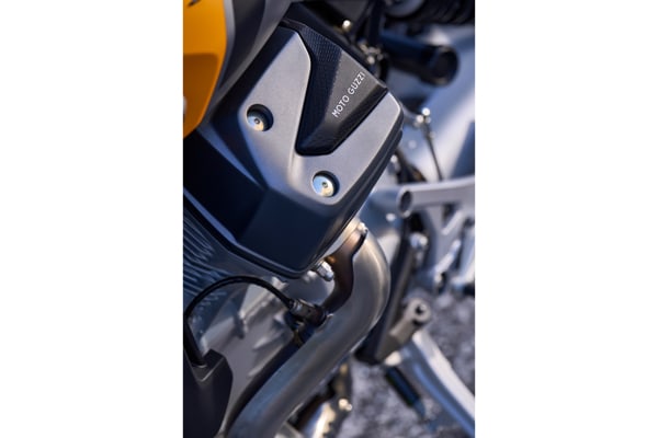 La progettazione ex novo ha permesso di ottenere un propulsore davvero compatto, 103 mm più corto dello small block di V85 TT e più leggero rispetto al 1200 8V, ultimo quattro valvole prodotto da Moto Guzzi. Un contributo importante è dato dalla frizione multidisco in bagno d’olio con comando idraulico e dotata di sistema antisaltellamento, più robusta, affidabile, compatta e leggera della soluzione a monodisco a secco adottata sugli altri modelli in produzione. Anche l’alternatore ha trovato una più vantaggiosa posizione, non più frontale, ma all’interno della V dei cilindri. Si distingue da tutti i recenti motori costruiti a Mandello del Lario anche per le teste ruotate di 90 gradi, scelta che permette di aumentare lo spazio per le gambe e di razionalizzare la posizione dei componenti della linea di aspirazione e dell’iniezione elettronica. I due corpi farfallati hanno infatti condotti ad alta turbolenza più corti e dritti, capaci di ottimizzare l’apporto di miscela aria/carburante nelle camere di combustione, con evidenti benefici sulla potenza, sulla regolarità di erogazione e sui consumi, a fronte di una minore emissione di gas inquinanti. La scelta della distribuzione a doppio albero a camme in testa con bilancieri a dito ha permesso di ottenere leggi di alzata delle valvole più aggressive a vantaggio delle prestazioni, ma anche una perfetta combustione, eliminando gli sprechi di carburante. A questo contribuisce il comando elettronico Ride by wire, che assicura una fine gestione del gas, senza alcun tipo di effetto on-off nell’apri/chiudi. La rotazione delle teste ha permesso di progettare un sistema di scarico con i due collettori dall’andamento sinuoso che confluiscono in un terminale a doppia uscita. I collettori hanno protezioni dal design studiato per deviare i flussi di aria calda dalle gambe del pilota.