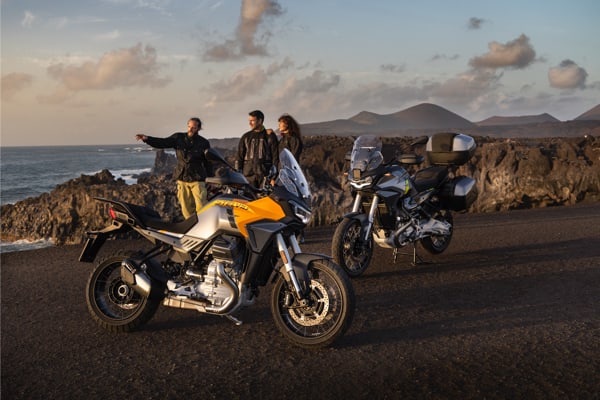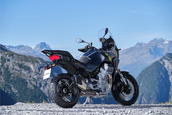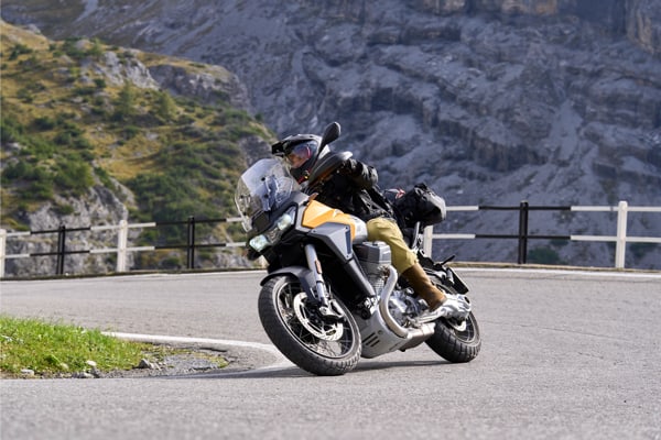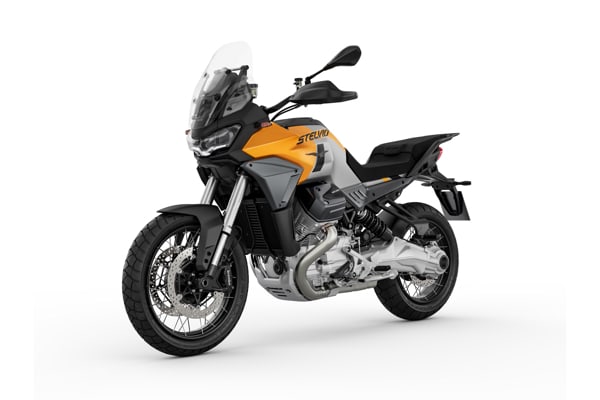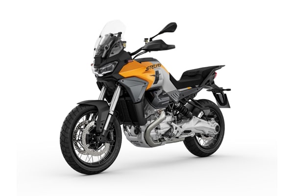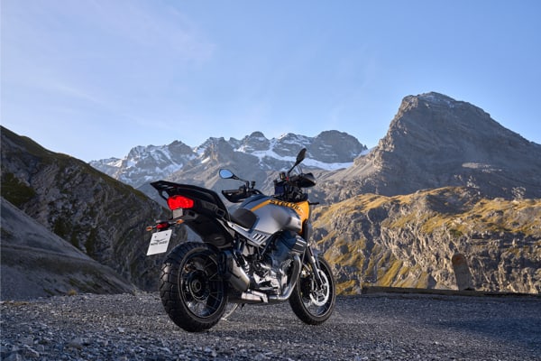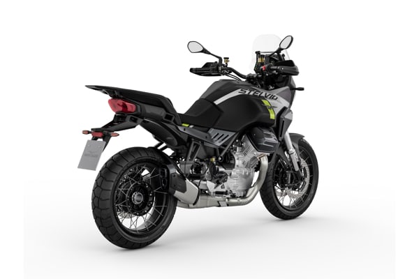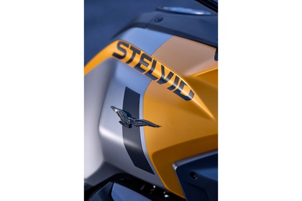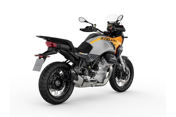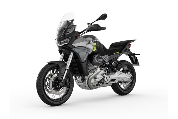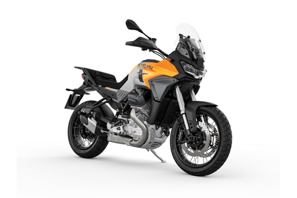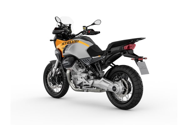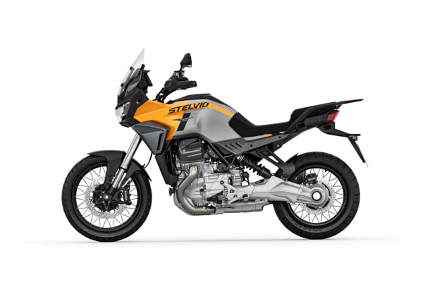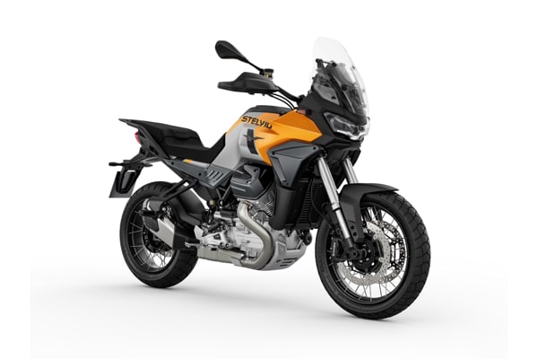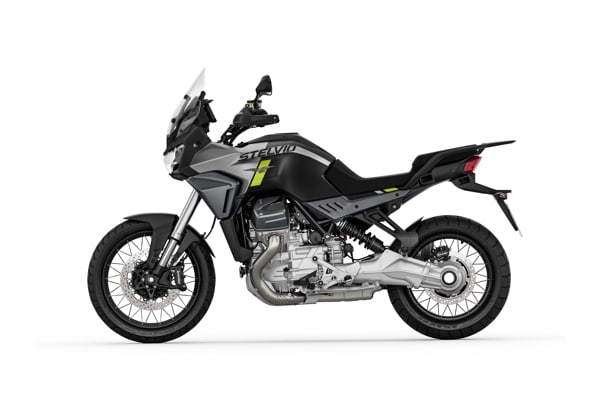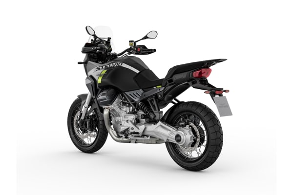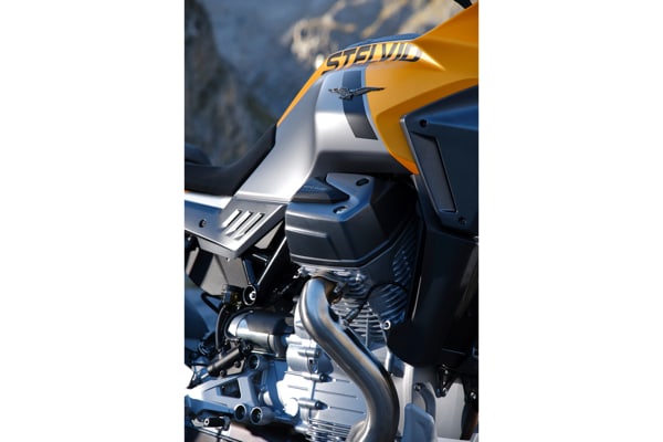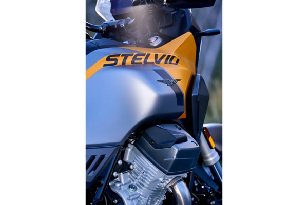 Rispetto all’unità che equipaggia V100 Mandello, è stato completamente ridisegnato nella parte anteriore per renderlo più robusto e adatto all’utilizzo avventuroso e vanta quote differenti. Inoltre, ha quattro punti di ancoraggio frontali al telaio al posto dei due di V100 Mandello, aumentando la rigidità del 20%. L’interasse di 1520 mm e l’inclinazione del cannotto di sterzo di 25,6°, regalano agilità e piglio sportivo nelle strade ricche di curve. L’attitudine al turismo è garantita dall’elevato comfort della generosa sella posta a soli 830 mm di altezza da terra e dalla posizione di guida attiva, con la schiena eretta e gambe poco piegate. È facile da gestire da fermo e si tocca bene con ambio i piedi a terra, per via di una zona centrale molto rastremata. Come da tradizione sulle moto on-off di Moto Guzzi, anche la nuova Stelvio prevede un ampio manubrio in alluminio a sezione variabile, perfetto per avere controllo in fuoristrada e al contempo una posizione di guida più rilassata nel turismo. Il passeggero è parte integrante del progetto e può contare su una porzione di sella ampia e ben imbottita e su grandi maniglie d’appiglio, con una postura che permette comodi trasferimenti. Molto ingegnoso è il sistema di ritenuta delle valigie (presenti nel ricco catalogo di accessori dedicati) che non necessita di alcun supporto ulteriore, lasciando così il look della moto inalterato quando non vengono utilizzate, risparmiando peso e contenendo gli ingombri laterali. Per fissarle è sufficiente sollevare la sella del passeggero e posizionare gli agganci delle valigie nelle sedi previste.