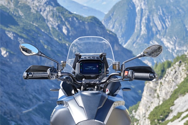 La prima con sensori radar per una guida più sicura. Stelvio è la prima Moto Guzzi dotata di PFF Rider Assistance Solution, offerto come factory option (la moto può essere ordinata con o senza). L’innovativa piattaforma di assistenza alla guida è basata sulla tecnologia Imaging Radar 4D ed è stata sviluppata da Piaggio Fast Forward, la società specializzata in robotica, con sede a Boston, fondata nel 2015 dal Gruppo Piaggio. È la prima volta che tali sensori radar (uno si trova sopra il gruppo ottico anteriore e uno sotto quello posteriore) vengono implementati per l’utilizzo su una moto, che rispetto a un’automobile ha una dinamica molto differente, con la significativa variabile dell’angolo di inclinazione in curva. I vantaggi, rispetto a un tradizionale sistema di assistenza alla guida basato su sensori a ultrasuoni, risiedono in un campo visivo estremamente ampio e in un monitoraggio affidabile indipendentemente dall'illuminazione e dalle condizioni ambientali. Questi dispositivi svolgono un ruolo fondamentale sul fronte della sicurezza attiva, garantendo le funzioni Following Cruise Control (FCC), Forward Collision Warning (FCW), Blind Spot Information System (BLIS) e Lane Change Assist (LCA). L’FCC è il sistema di cruise control avanzato che sfrutta il radar anteriore per adeguare la velocità in dipendenza di quella del veicolo davanti. Il sistema agisce sul controllo del freno motore, aumentandolo nel caso in cui il veicolo di fronte rallenti. L’FWC utilizza il radar anteriore per rilevare possibili collisioni con veicoli ed oggetti situati davanti alla moto. Il BLIS avverte il guidatore della presenza di veicoli nell’angolo cieco degli specchi retrovisori. Monitorando costantemente la zona retrostante fino a 30 metri di distanza, la funzione LCA riesce a individuare anche i veicoli che si stanno avvicinando lateralmente, creando una potenziale situazione di pericolo nel caso in cui si voglia cambiare corsia. In tutti i casi il pilota viene avvertito attraverso apposite segnalazioni acustiche e visive sulla strumentazione e sugli specchietti retrovisori.