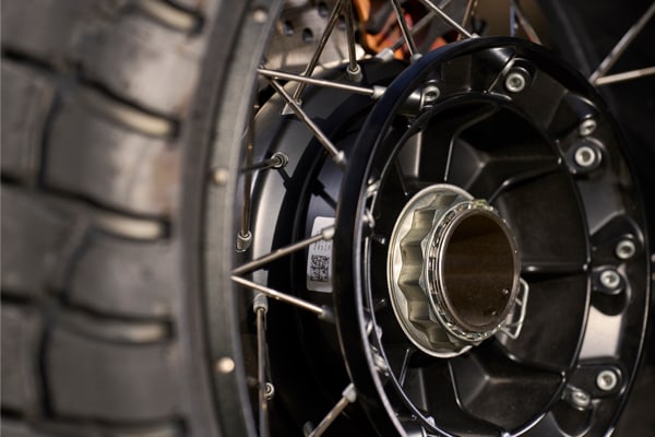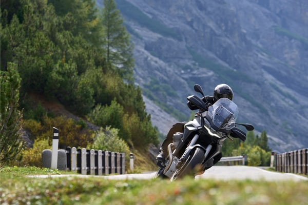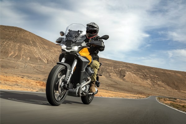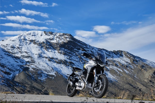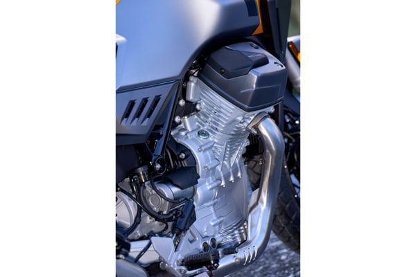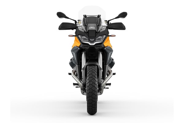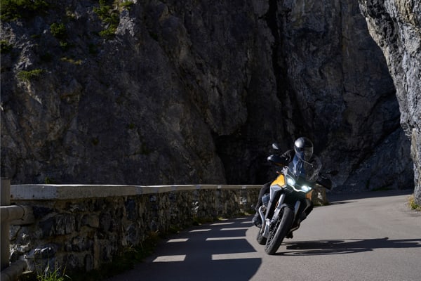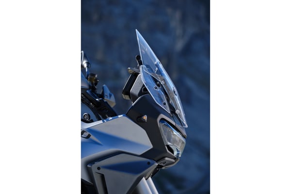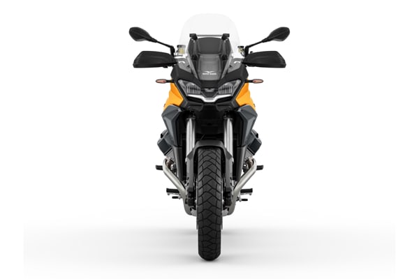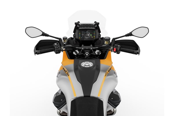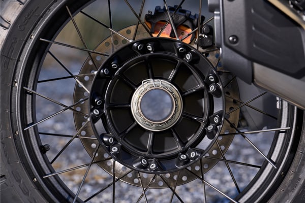 L’impianto frenante Brembo si avvale all’avantreno di una coppia di dischi in acciaio flottanti da 320 mm su cui agiscono pinze monoblocco ad attacco radiale. Anche la pompa al manubrio è radiale, così come lo è quella della frizione (entrambe hanno le leve regolabili nella distanza con manubrio). Il freno posteriore conta su un disco da 280 mm servito da una pinza a doppio pistoncino. I cerchi a raggi tubeless (quello anteriore da 19” e quello posteriore da 17”) ospitano pneumatici dalla struttura e scolpitura adatta anche al fuoristrada leggero.