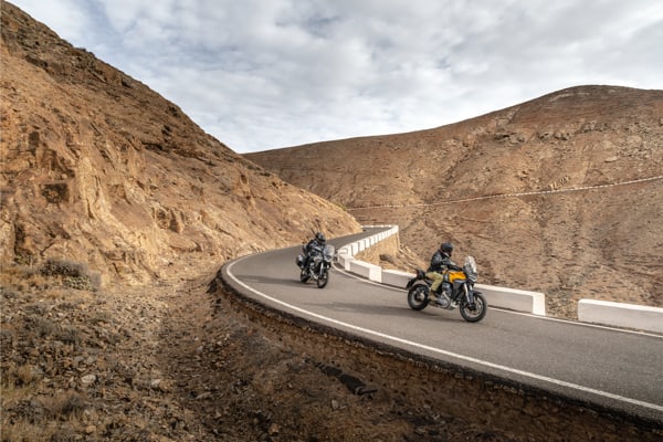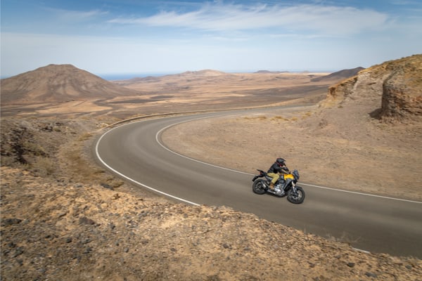 Pioggia: tutti gli interventi elettronici sono regolati per affrontare al meglio le situazioni meteorologiche difficili. Il freno motore è ad un livello medio; l’erogazione della potenza è molto dolce (livello 3 su 3); il controllo di trazione è al massimo livello per una totale sicurezza in accelerazione. Strada: le logiche di intervento privilegiano la guida su strada. Il freno motore è ad un livello medio; l’erogazione della potenza (MGCM) è progressiva (livello 2 su 3); il controllo di trazione (MGCT) è al secondo livello su quattro. Sport: le regolazioni elettroniche sono messe a punto per garantire la migliore esperienza di guida sportiva. Il freno motore è poco presente; l’erogazione della potenza (MGCM) è più diretta e sportiva (livello 1 su 3); il controllo di trazione (MGCT) è il meno invasivo (primo livello su quattro), mentre l’ABS ha una calibrazione che permette frenate molto decise. Off-Road: è la modalità specificamente sviluppata per la guida in fuoristrada. Il freno motore è molto presente e l’erogazione della potenza è la più diretta. Traction control e ABS hanno specifiche tarature per il fuoristrada: il primo a livello minimo di intervento, mentre il secondo è presente solo sulla ruota anteriore. Questa scelta permette di divertirsi in fuoristrada, senza il rischio di perdere il controllo del veicolo. È tuttavia possibile eliminare sia il traction control (in tutti i riding mode) sia l’ABS su ambo le ruote (nella sola modalità Off-Road).