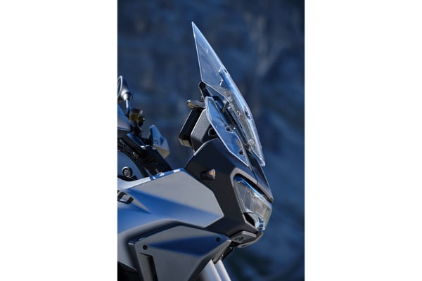 L’aerodinamica ha beneficiato di uno studio molto approfondito, grazie a un gruppo di ingegneri coinvolti solo in questo aspetto, per massimizzare la protezione dall’aria, il comfort e il piacere di guida, coerentemente con la storia di Moto Guzzi, primo brand motociclistico a dotarsi di una propria galleria del vento. Sono state necessarie oltre 1500 ore di simulazioni con software di calcolo CFD (Computational Fluid Dynamics) e molte sedute in galleria del vento per determinare le superfici ideali che offrissero la massima protezione al pilota e al passeggero, a fronte di ingombri non elevati. Anche il parabrezza è stato oggetto di un particolare studio ed ha una forma in grado di deviare i flussi evitando vortici di aria posteriori, coadiuvato dalla presenza dei due deflettori laterali. Per adattarsi a differenti stature, è regolabile elettricamente in altezza fino ai 150 km/h, con un’escursione di ben 70 mm. Anche Moto Guzzi Stelvio evoca iconici modelli della sua storia, citando elementi come le feritoie presenti nei fianchetti sottosella, ma la modernità e l’innovazione prevalgono nella loro reinterpretazione.