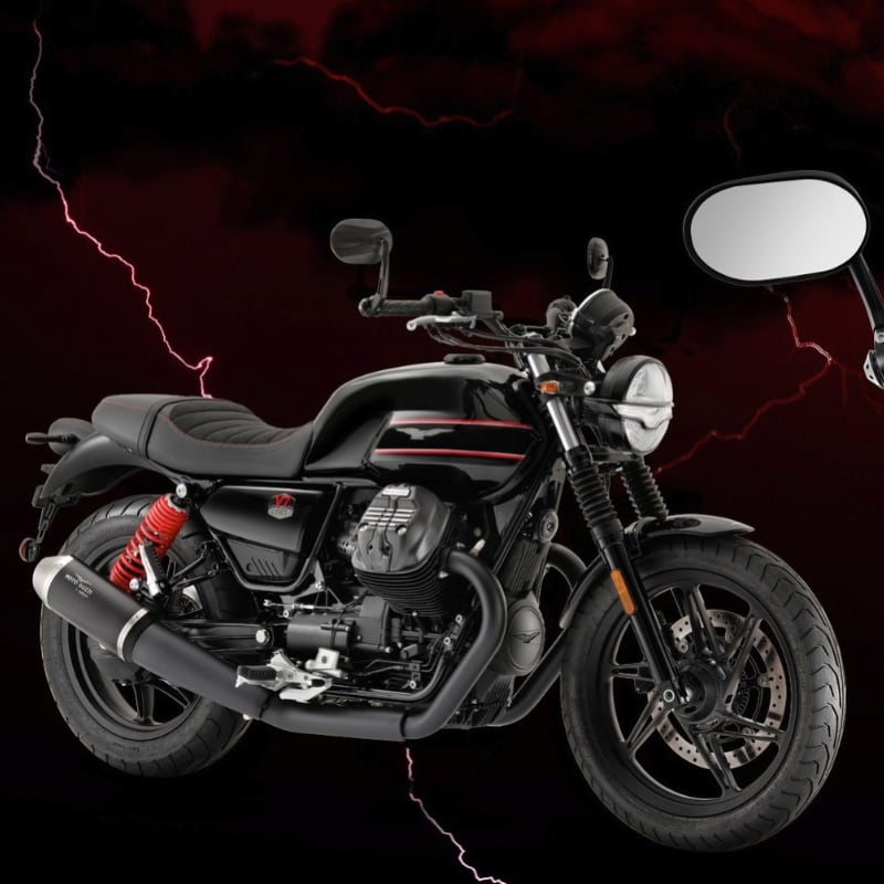Gli specchietti bar-end fissati alle estremità del manubrio, assieme ai soffietti della forcella e al parafango anteriore corto completano la dotazione, amplificando la sensazione di qualità percepita davvero elevata.