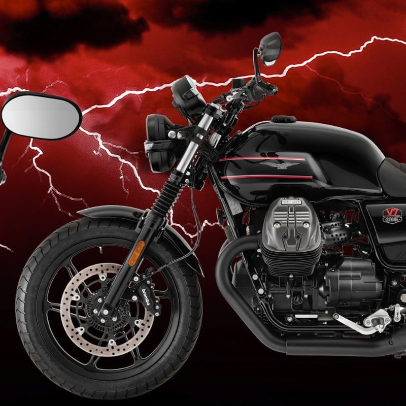 MOTO GUZZI V7 STONE SPECIAL EDITION. La V7 è una delle Moto Guzzi più amate e diffuse; è autentica e ricca di carattere ed è la rappresentante della motocicletta classic italiana per eccellenza. La V7 Stone Special Edition è la prima inedita proposta della V7 Stone dal carattere decisamente dinamico. Abbandona le tinte opache tipiche della versione Stone - la più contemporanea della famiglia V7 - per vestire la speciale colorazione lucida dedicata Shining Black, arricchita sul serbatoio da grafiche con dettagli rossi che richiamano la tradizione stilistica dei modelli più sportivi dell’Aquila. Una sportività sottolineata anche dalle molle degli ammortizzatori verniciate in rosso e dalle cuciture rosse a contrasto della sella, anch’essa dedicata a questo modello unico.
