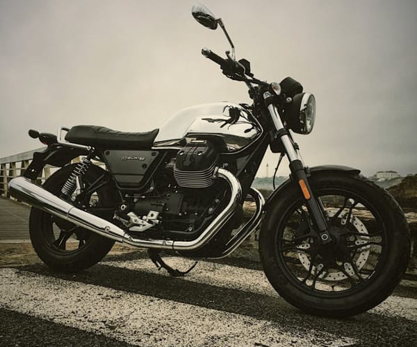 Anche il twin 750 Moto Guzzi si presenta in una veste raffinata, con le protezioni dei corpi farfallati in alluminio anodizzato nero e le teste cilindri con le alette di raffreddamento fresate che creano un ulteriore gioco di contrasti. L’essenziale strumentazione è a singolo quadrante circolare, con scala del tachimetro analogica e le altre informazioni racchiuse nel riquadro digitale.