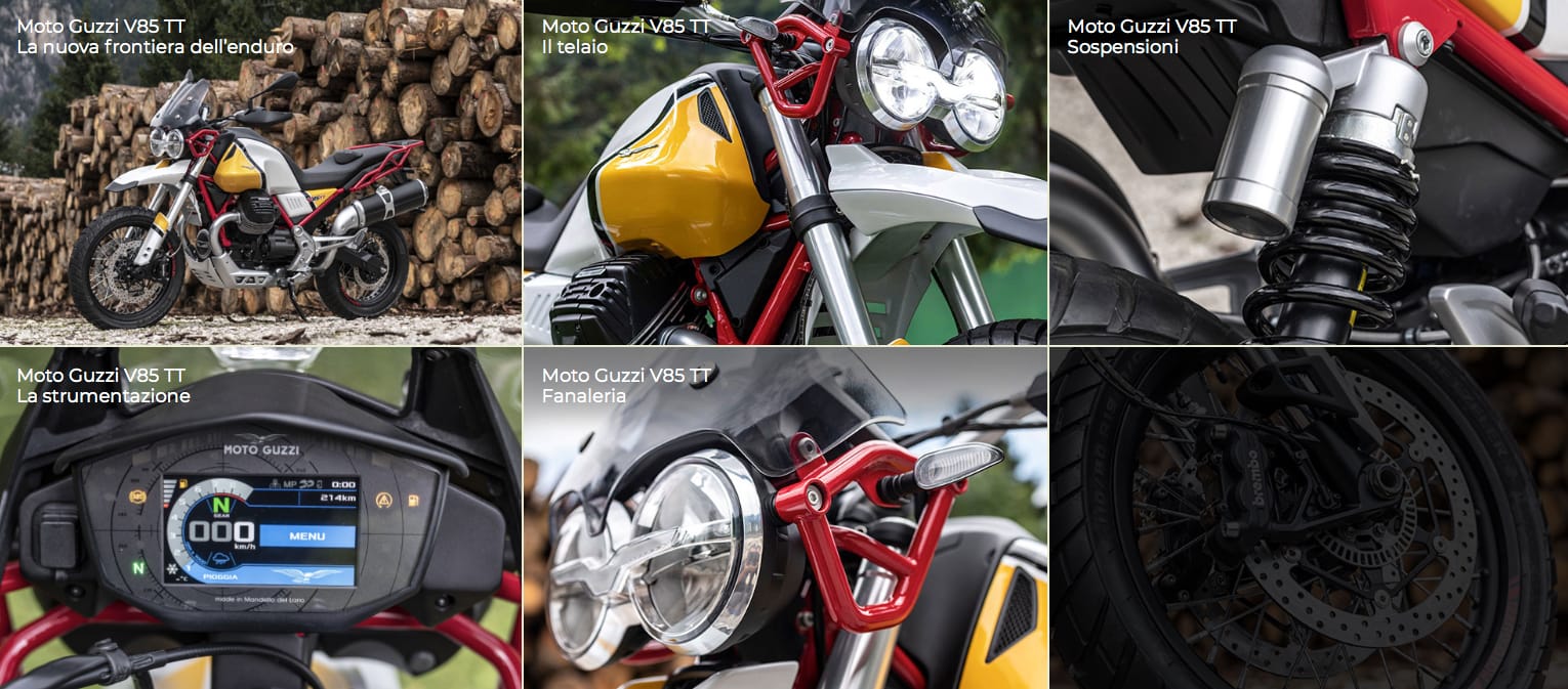 Moto Guzzi V85 TT è la prima classic enduro dedicata al turismo, capace di offrire prestazioni e tecnologie moderne racchiuse in un corpo dallo stile ricco dei valori e della tradizione quasi centenaria di Moto Guzzi. Moto Guzzi V85 TT nasce sulla base di una nuova piattaforma tecnica ed è spinta da un inedito motore da 80 CV e 80 Nm, un bicilindrico trasversale a V di 90° come da tradizione della Casa, unico al mondo per schema costruttivo e sensazioni di guida.